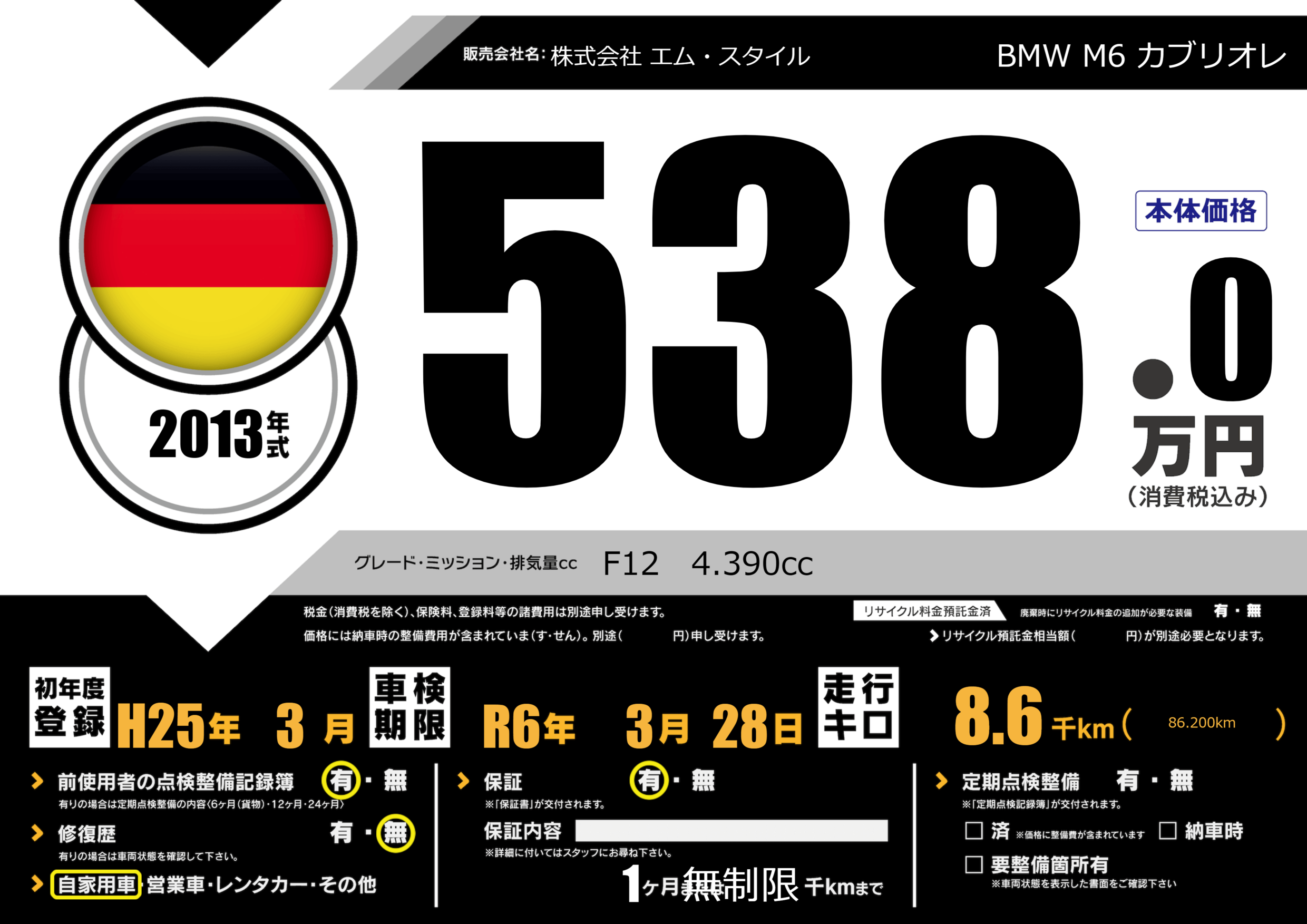 | 車名 | BMW M6 カブリオレ | グレード ミッション 排気量 |