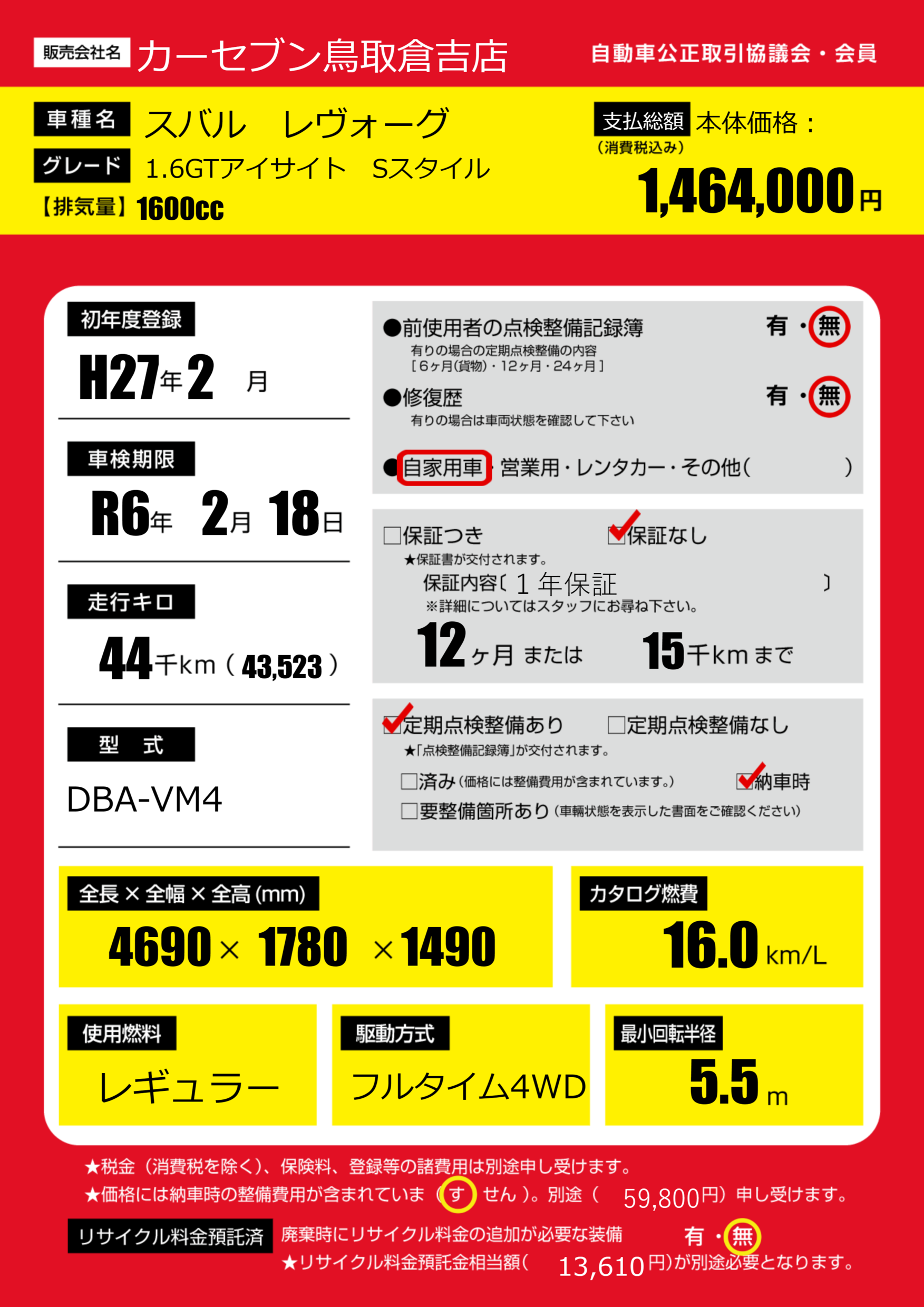 | 車名 | スバル レヴォーグ | グレード ミッション 排気量 |