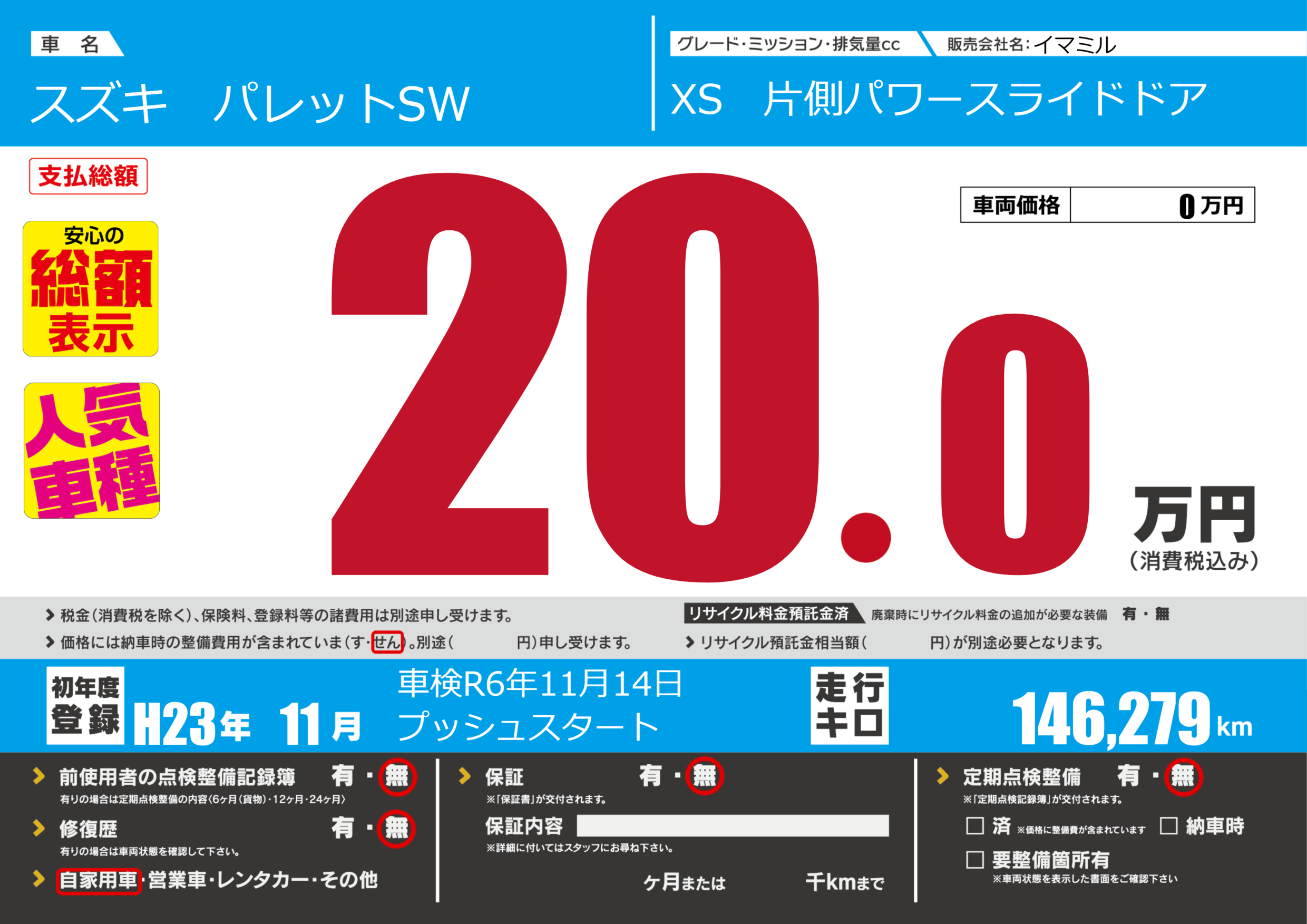 | 車名 | スズキ パレットSW | グレード ミッション 排気量 |