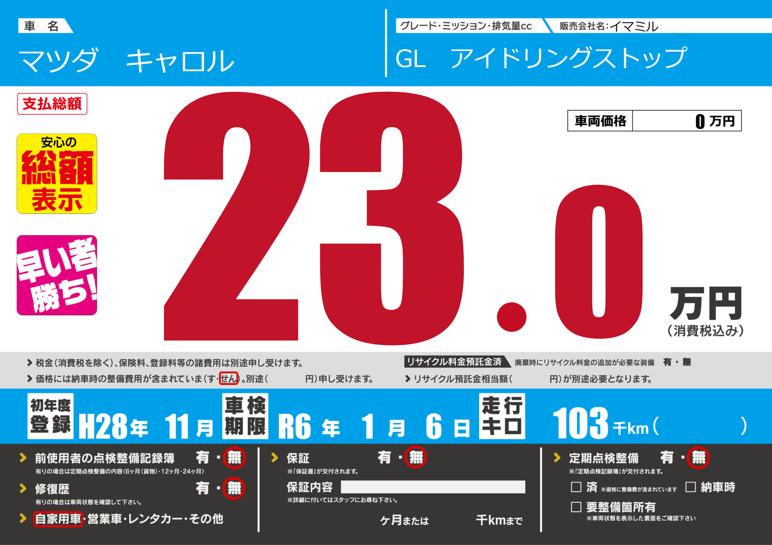 | 車名 | マツダ キャロル | グレード ミッション 排気量 |