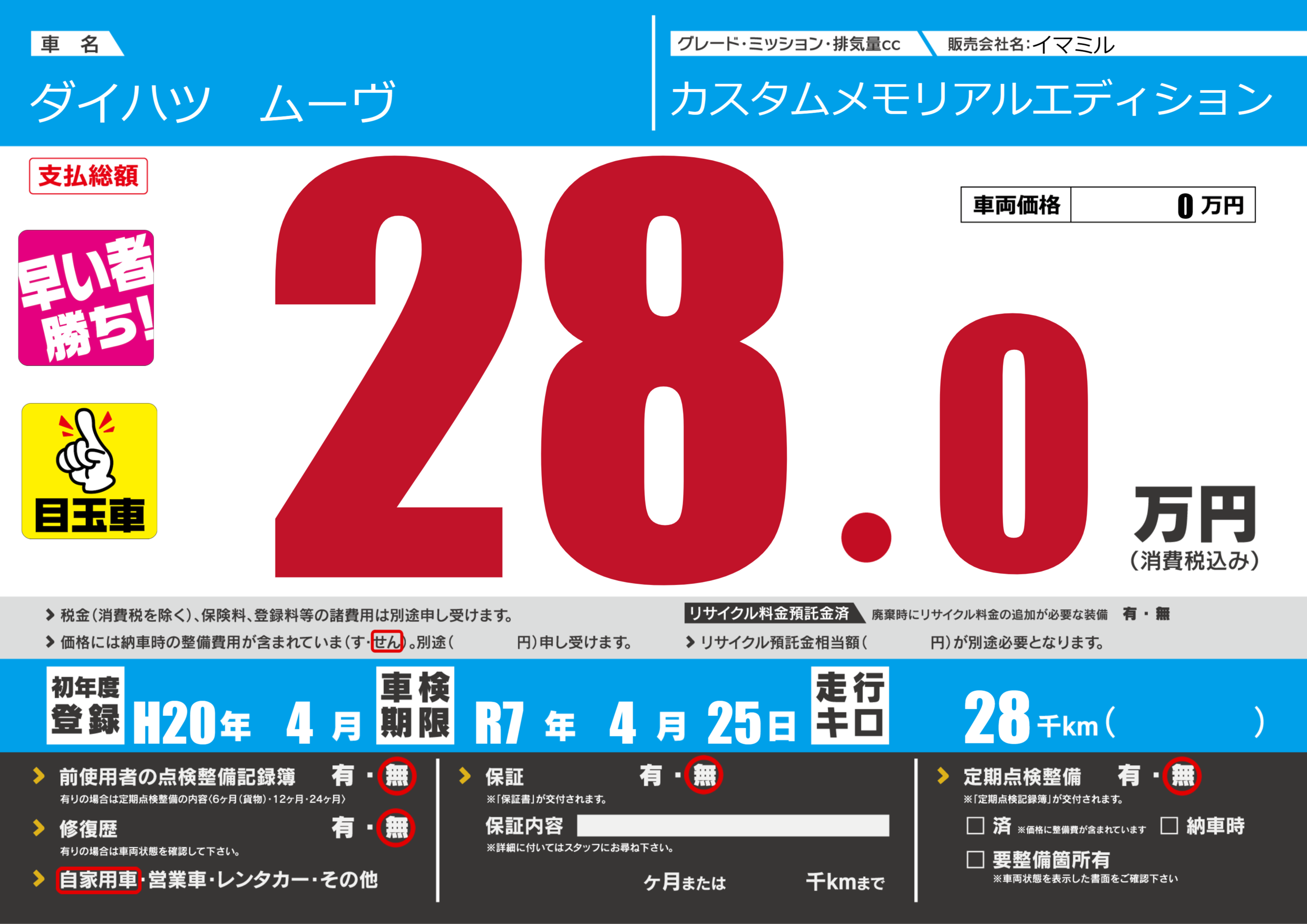| 走行キロ | 2.8万km | 初年度登録 | H20年4月 |
