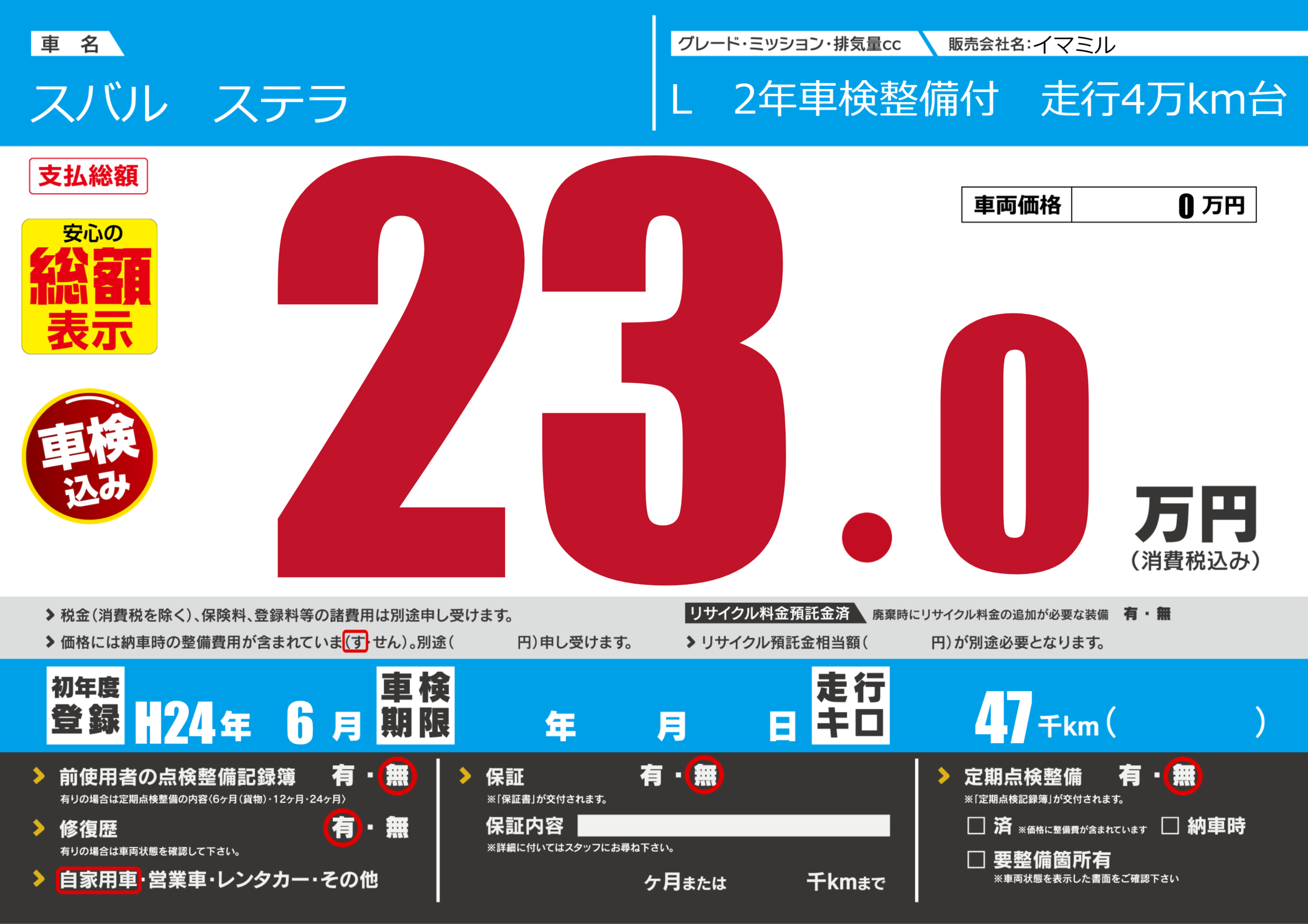 | 車名 | スバル ステラ | グレード ミッション 排気量 |
