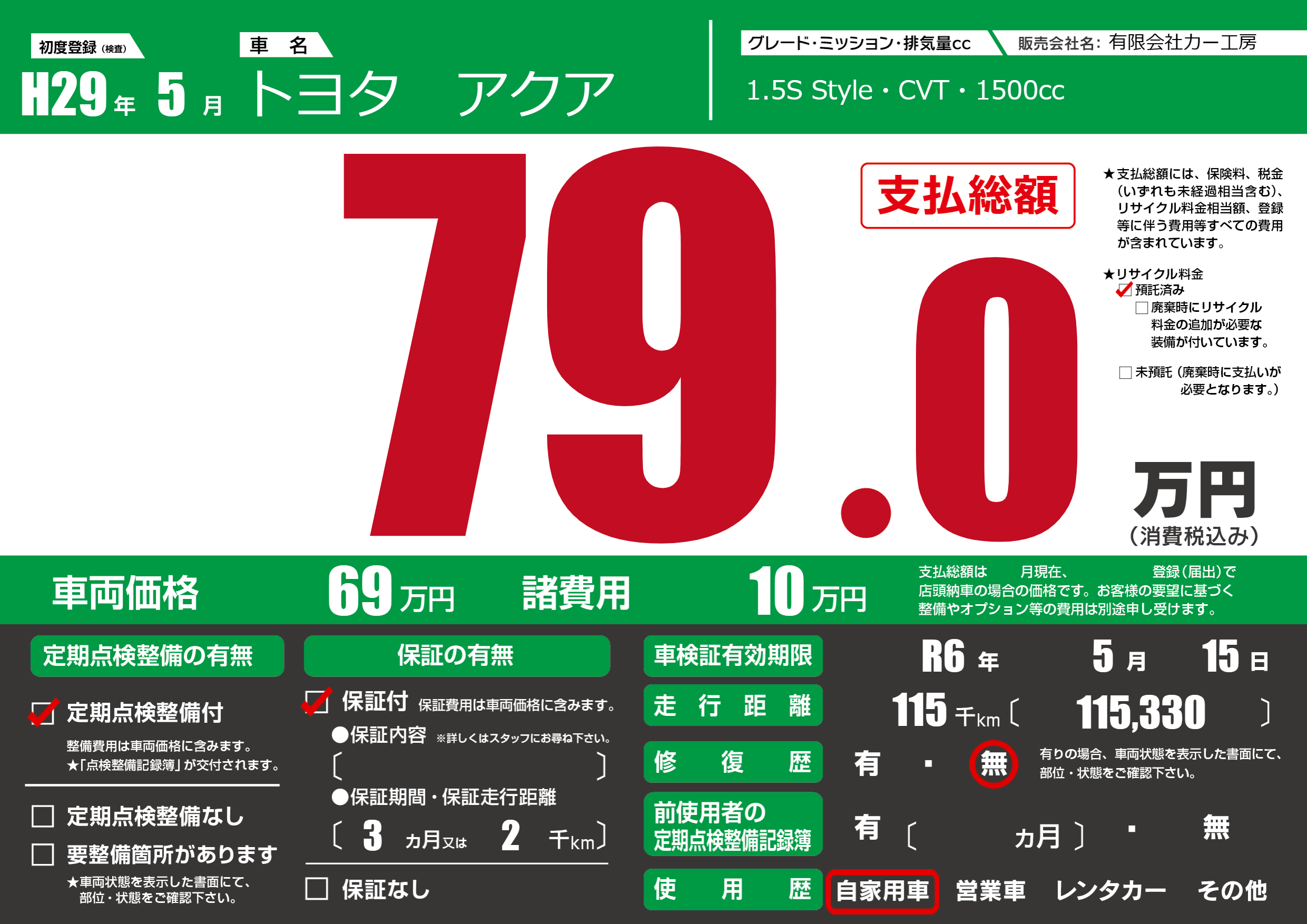 | 車名 | トヨタ アクア | グレード ミッション 排気量 |
