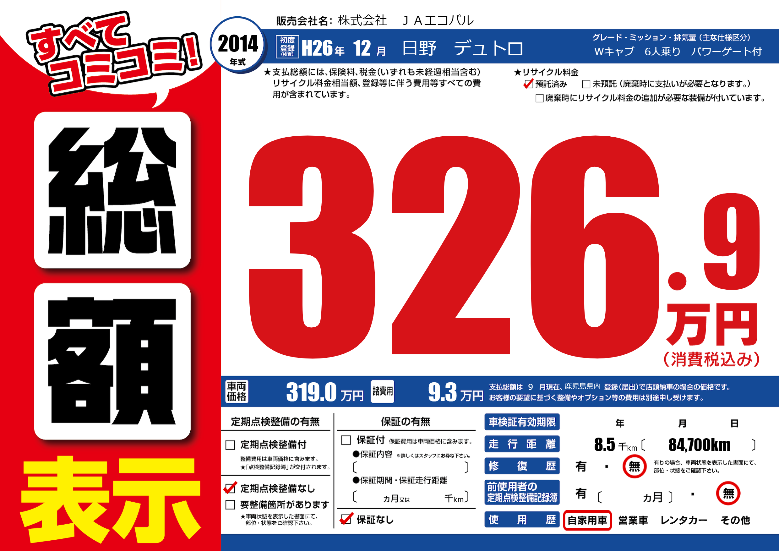 | 車名 | 日野 デュトロ | グレード ミッション 排気量 |