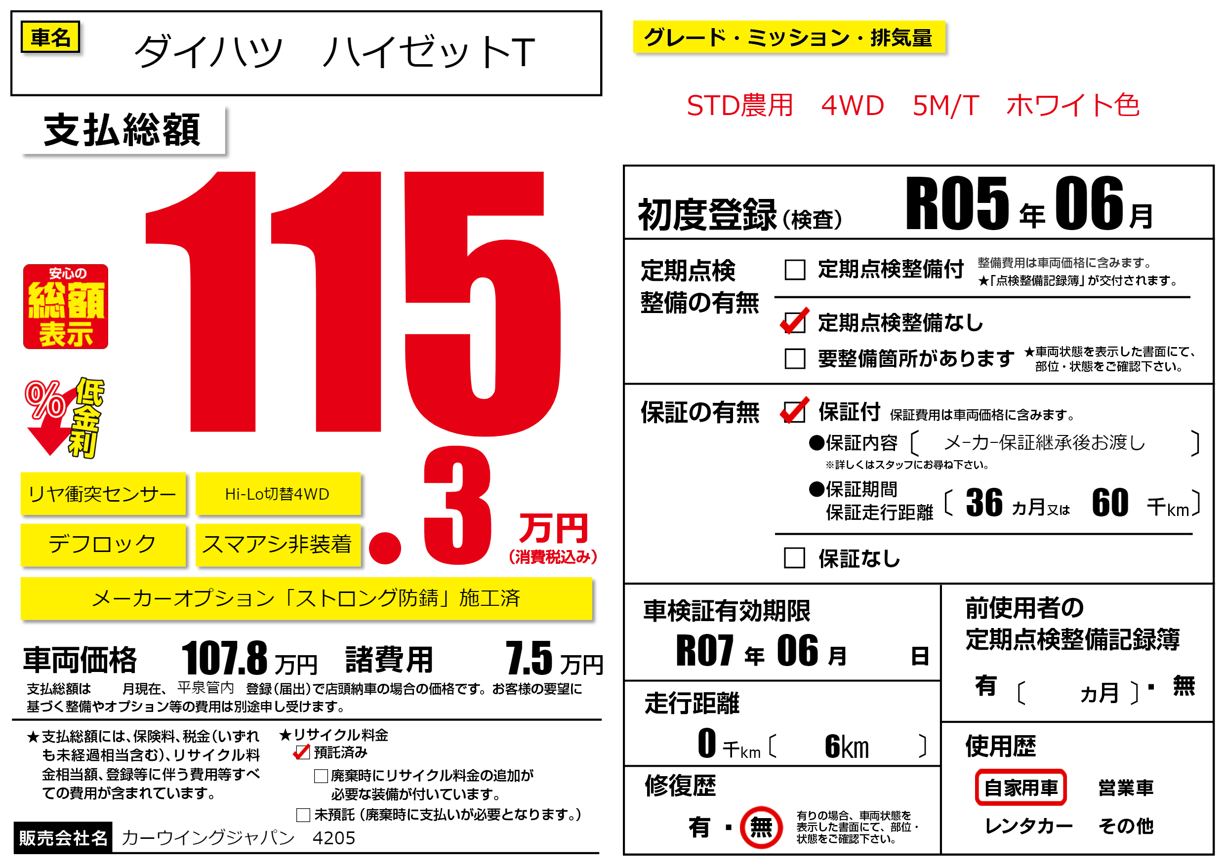 | 車検制限 | R07年 06月 - 日 | ||