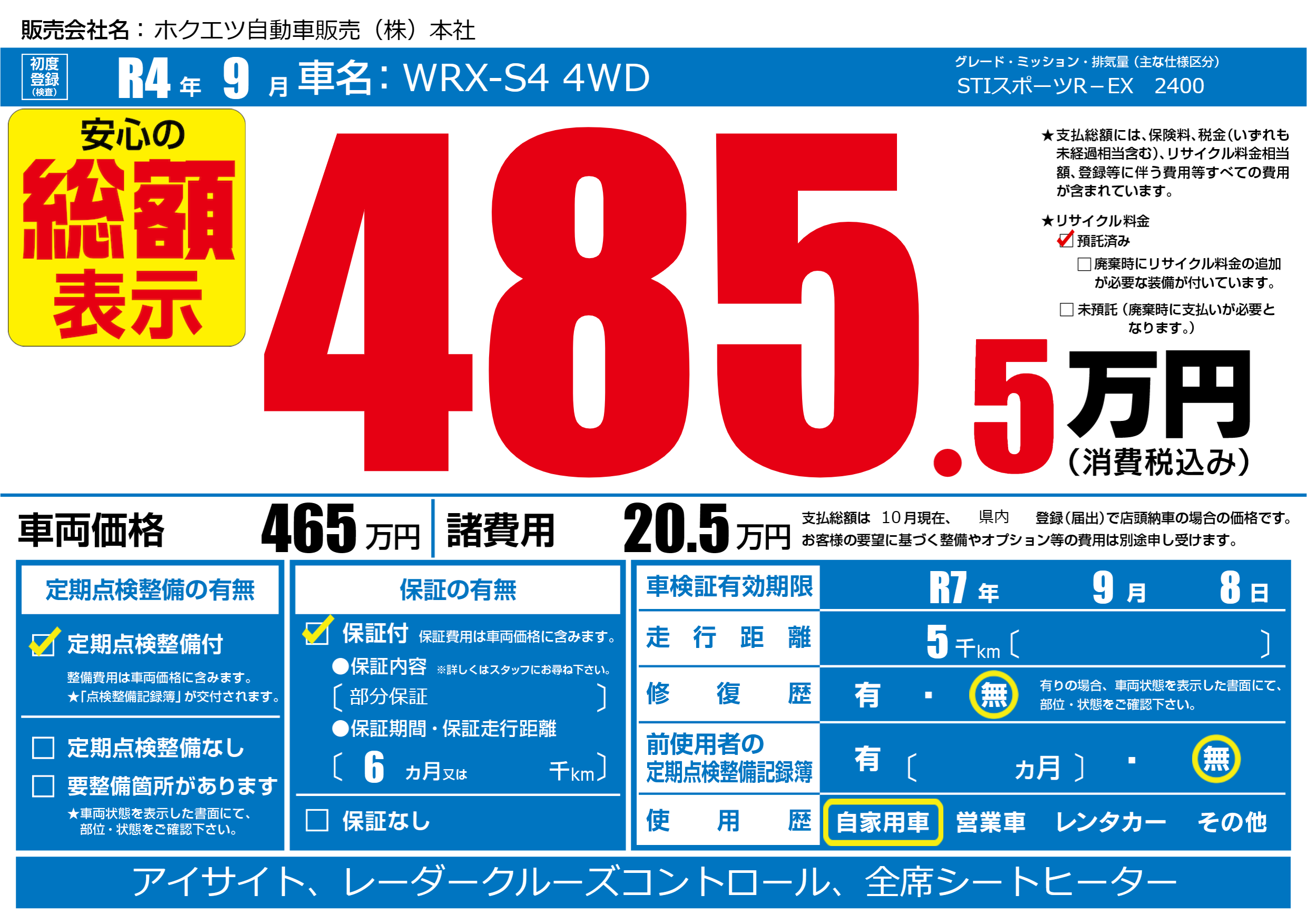 | 車名 | WRX-S4 4WD | グレード ミッション 排気量 |