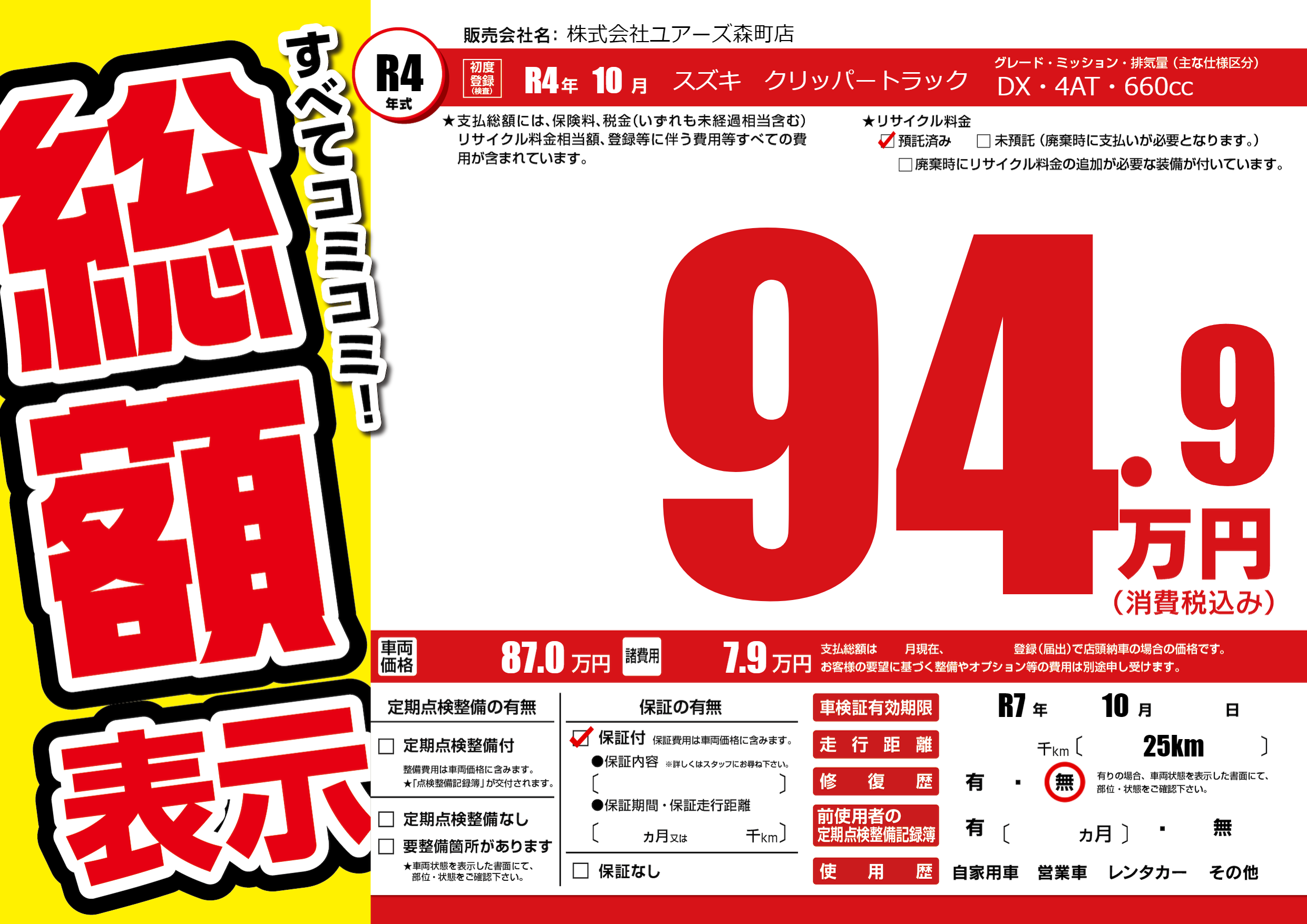 なし | 車検制限 | R7年10月---月 |