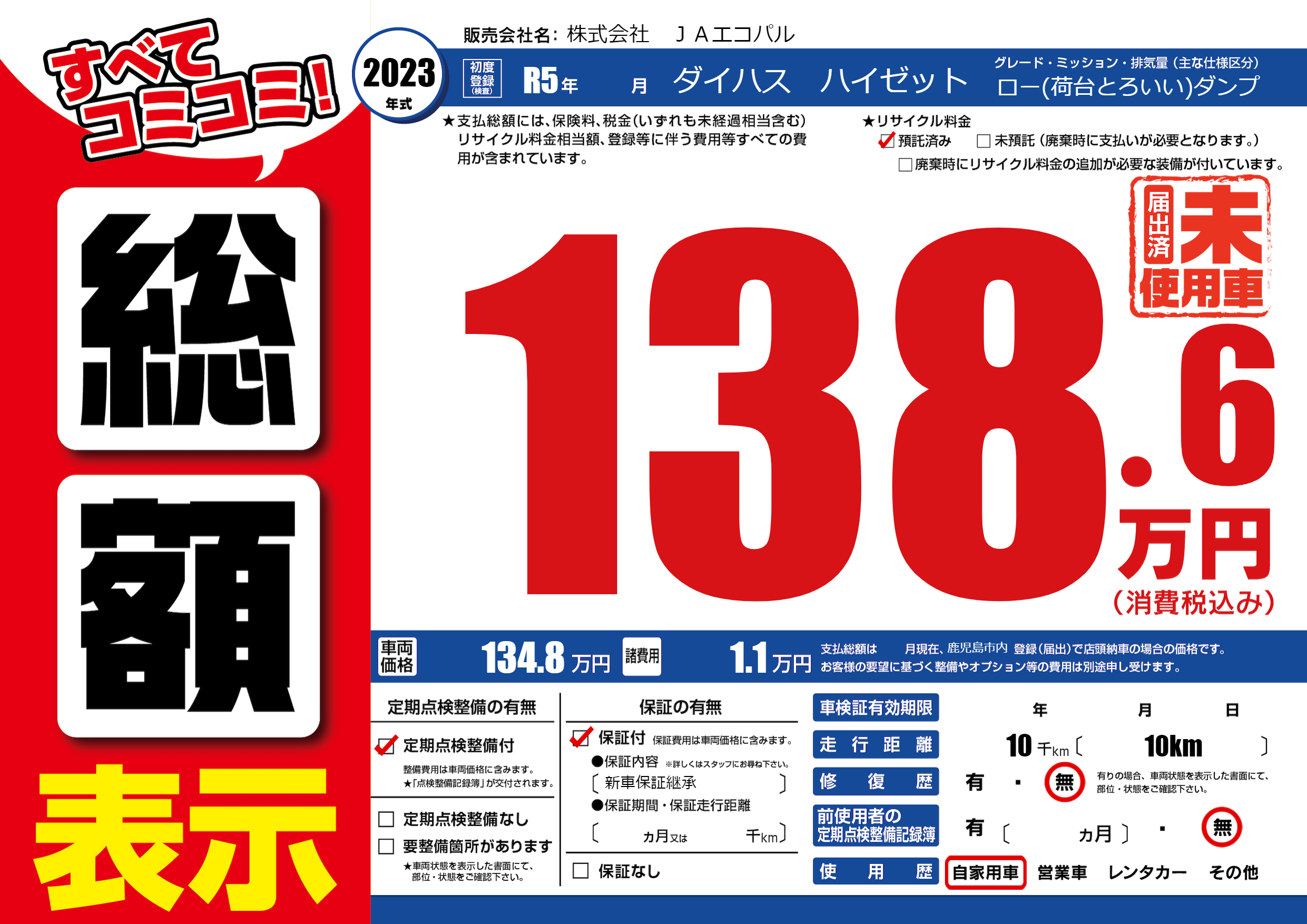 保証なし 保証内容(新車保証継承) ヶ月または千km |