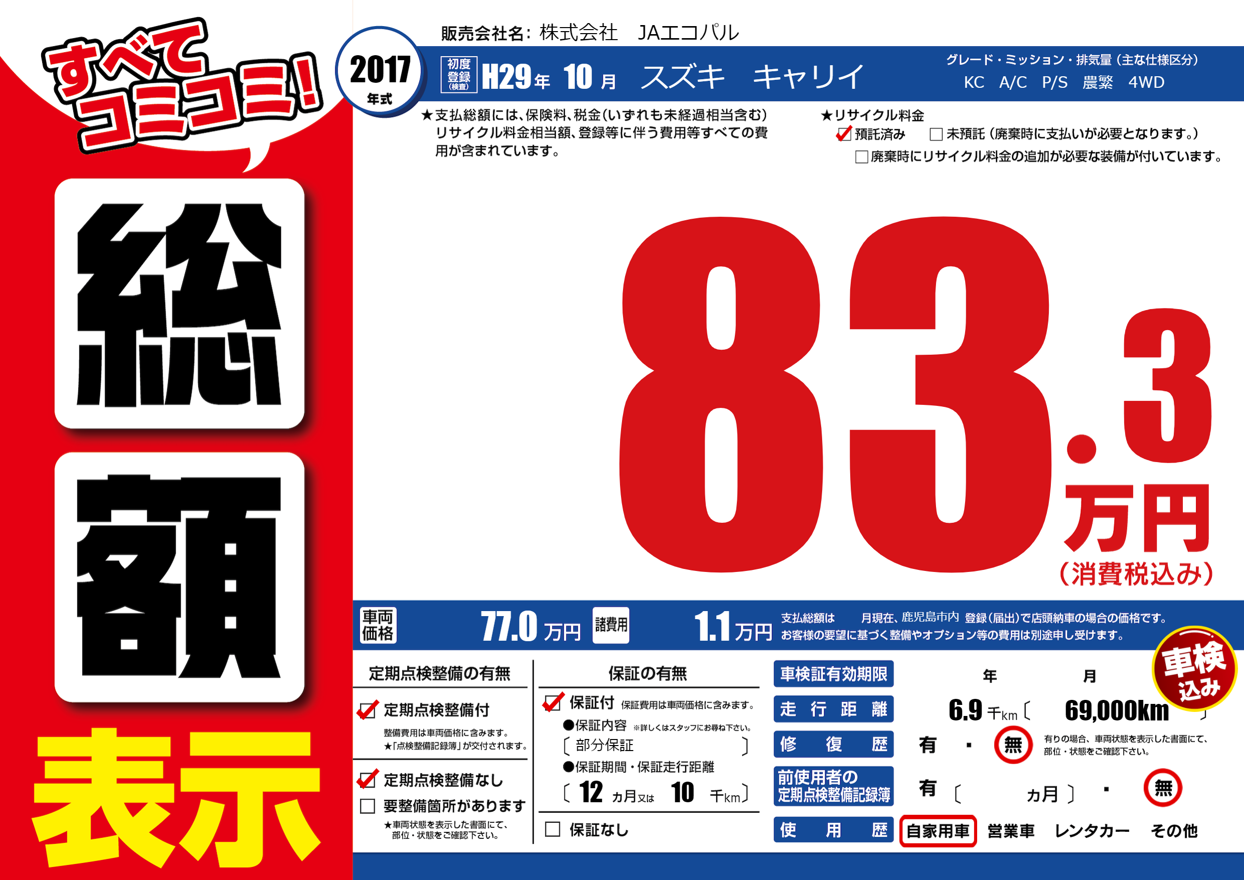 | 車名 | スズキ キャリイ | グレード ミッション 排気量 |