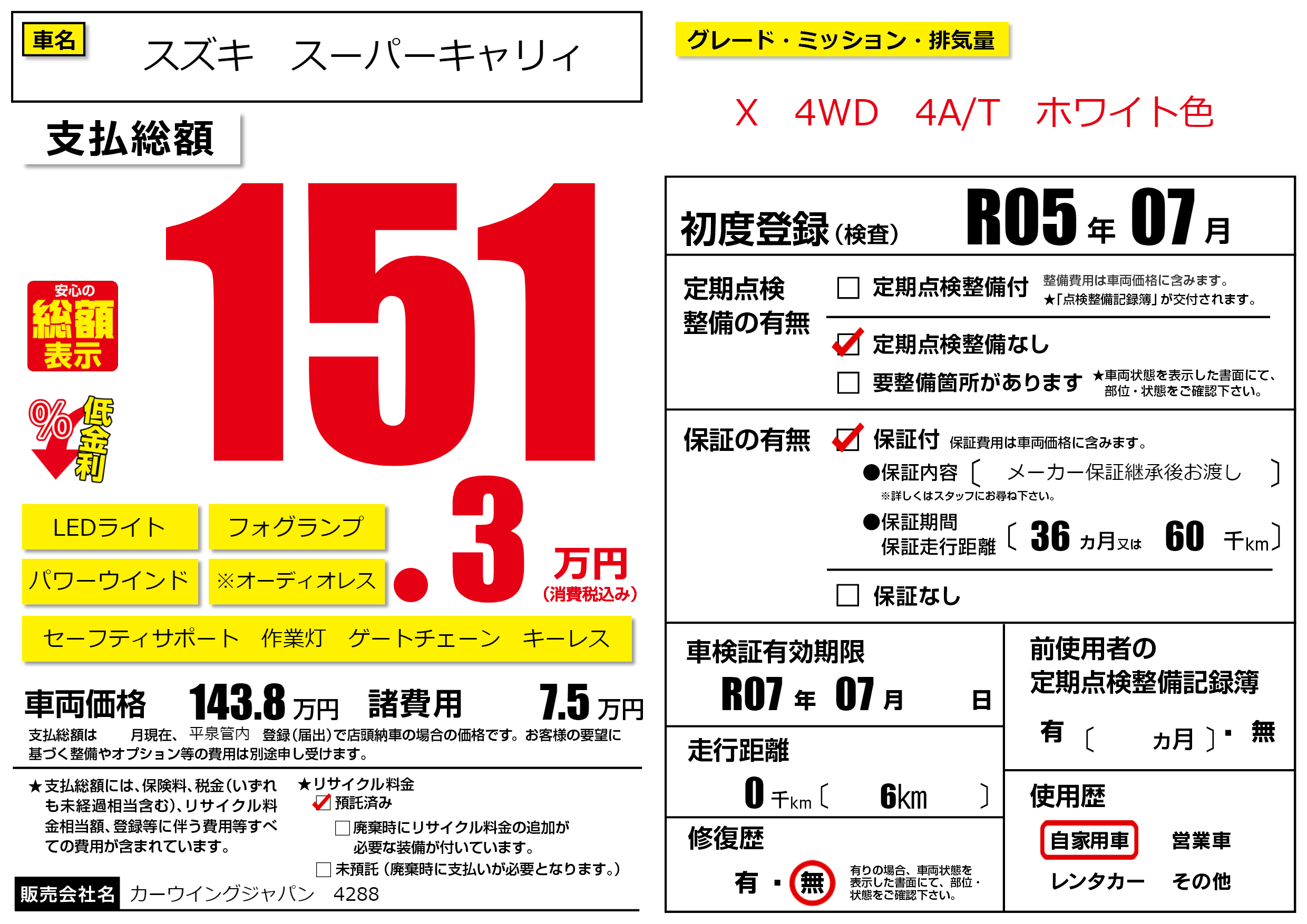 | 車名 | スズキ スーパーキャリィ | グレード ミッション 排気量 |