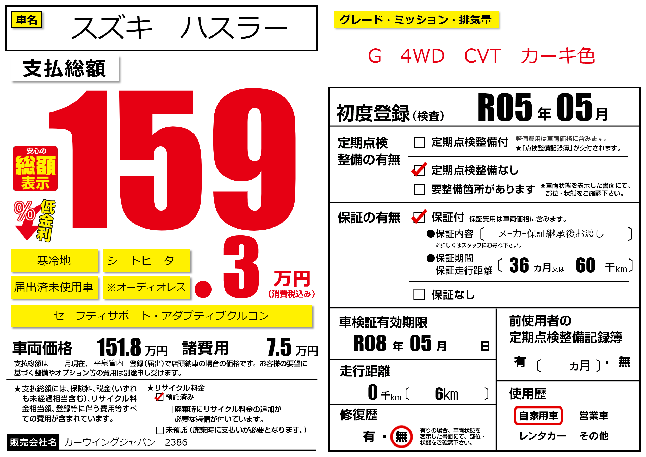 | 車名 | スズキ ハスラー | グレード ミッション 排気量 |
