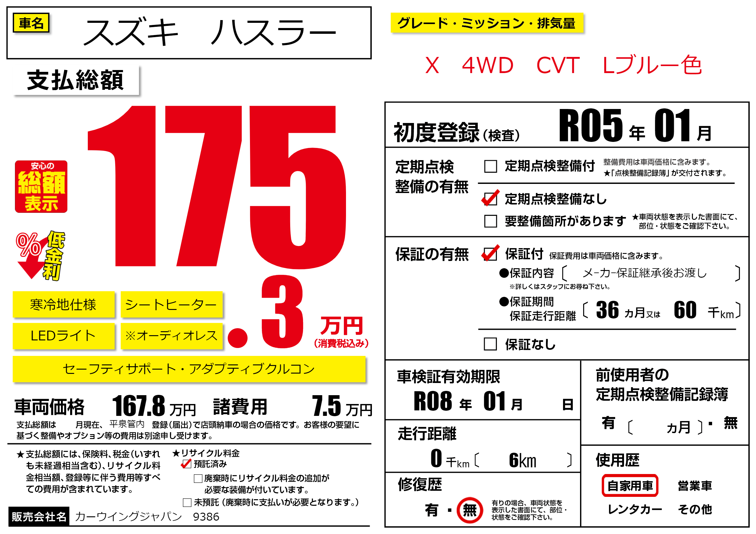 | 車名 | スズキ ハスラー | グレード ミッション 排気量 |