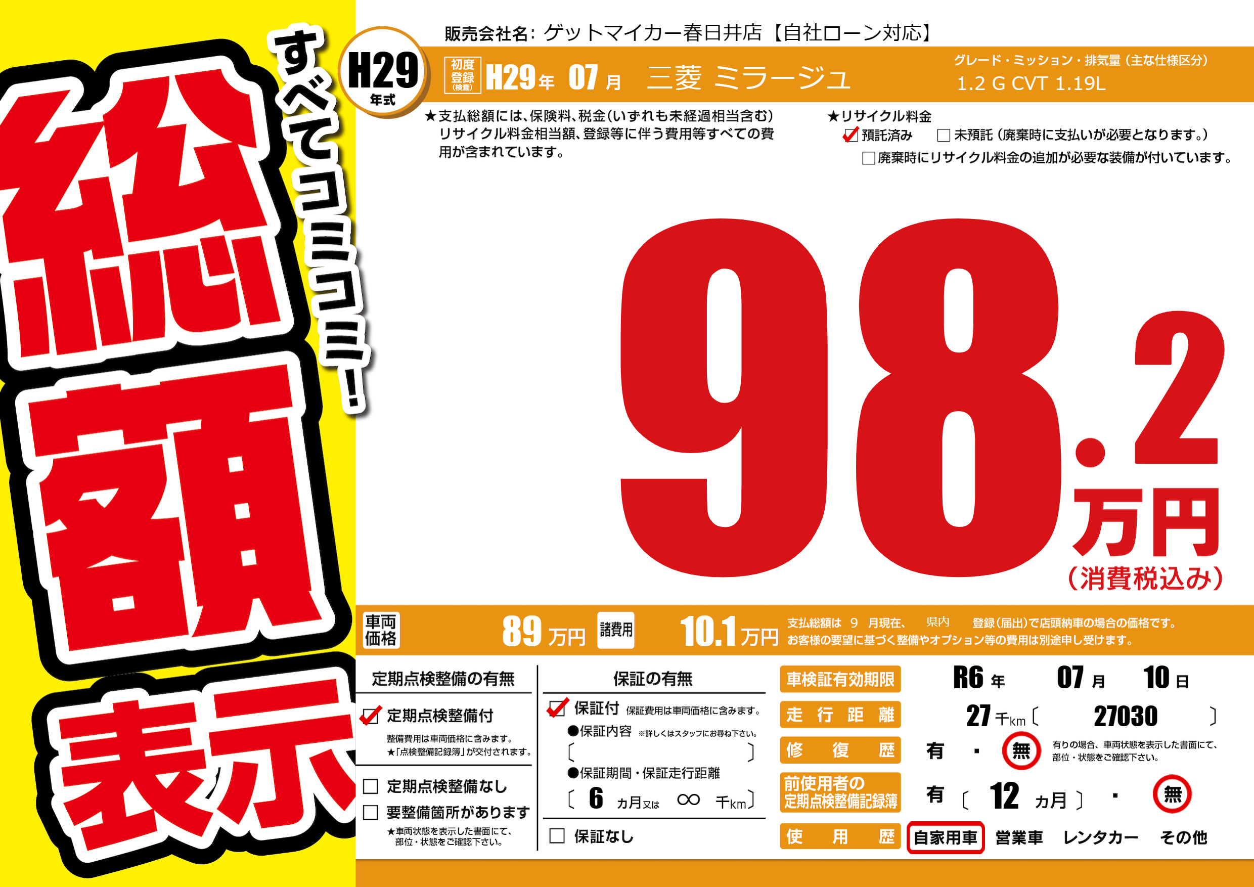 | 走行キロ | 2.7万km | 初年度登録 | H29年07月 |