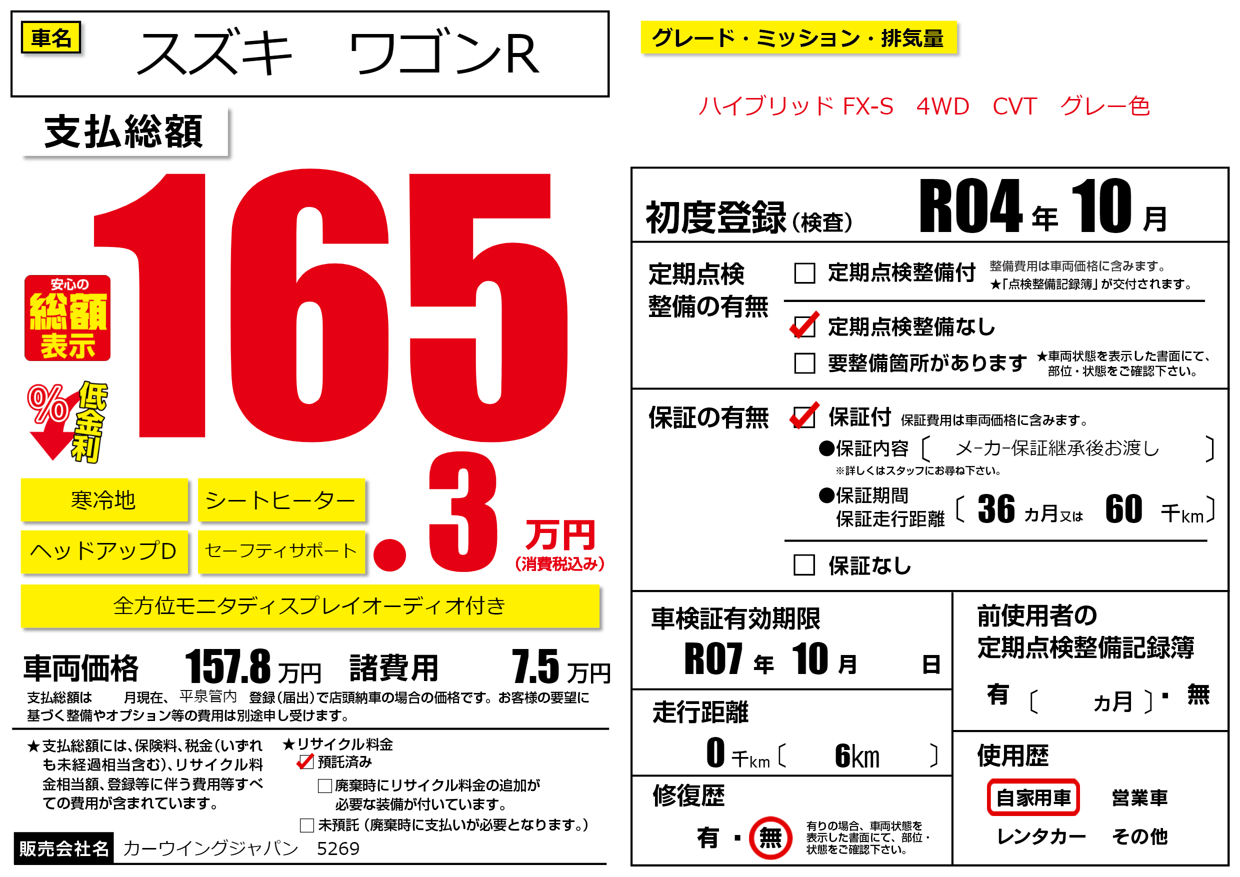 | 車名 | スズキ ワゴンR | グレード ミッション 排気量 |