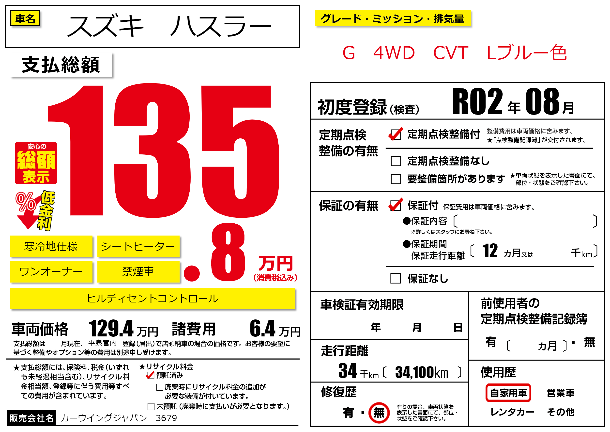 | 車名 | スズキ ハスラー | グレード ミッション 排気量 |