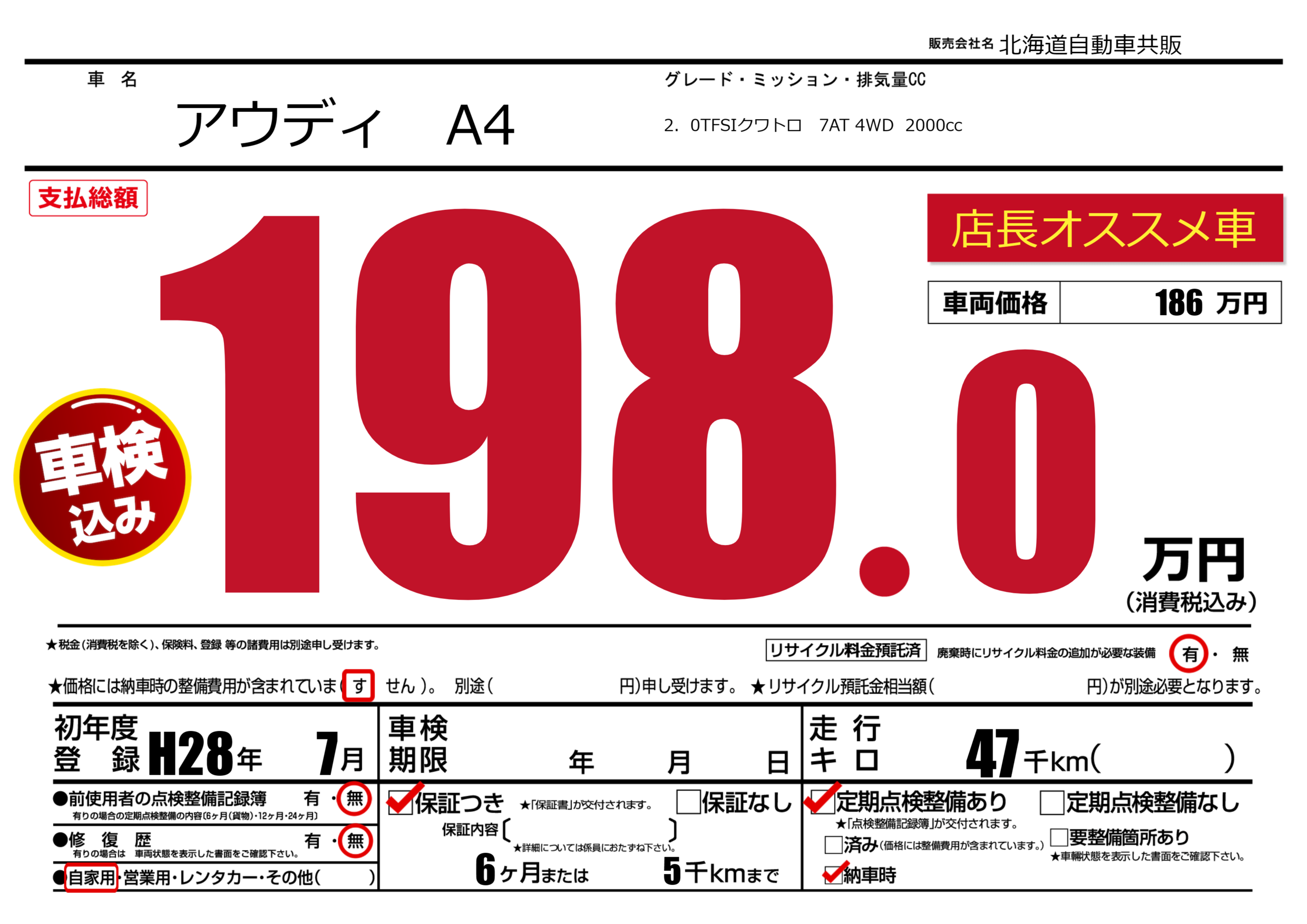 | 車名 | アウディ A4 | グレード ミッション 排気量 |