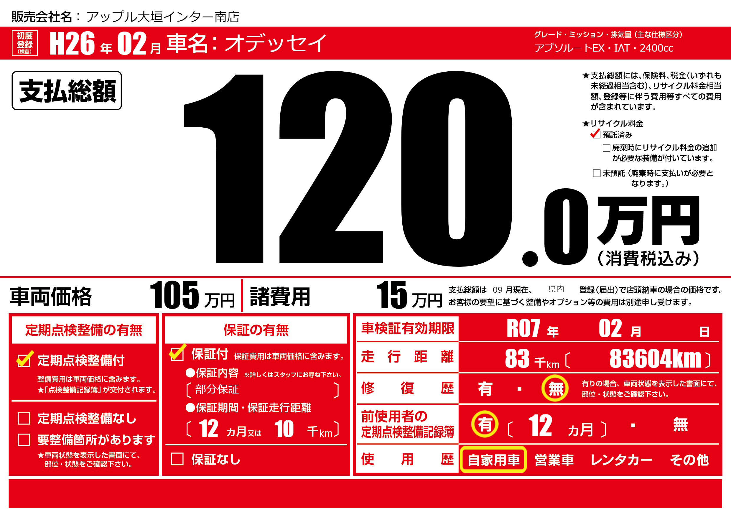 | 車名 | オデッセイ | グレード ミッション 排気量 |