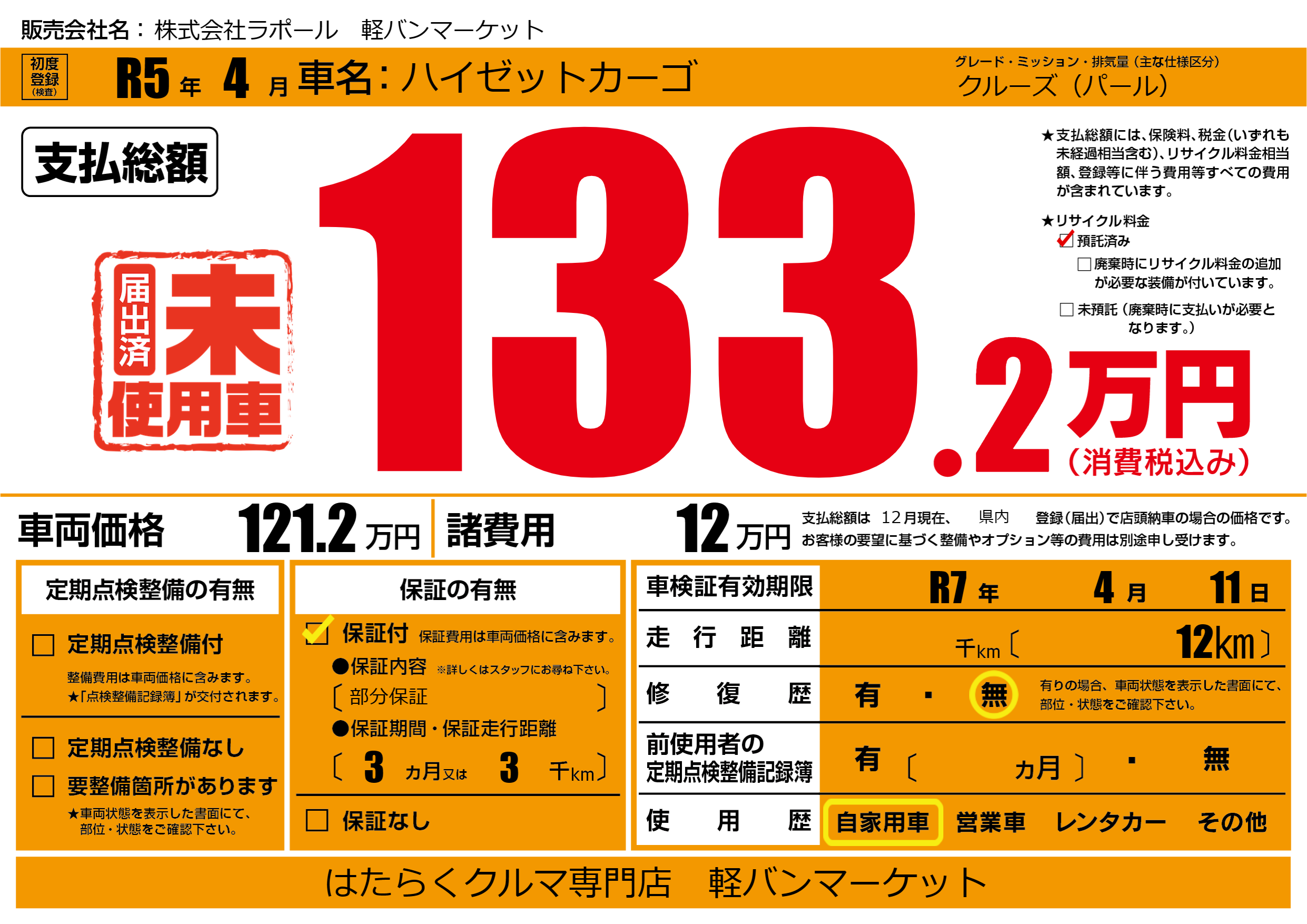 | 車名 | ハイゼットカーゴ | グレード ミッション 排気量 |