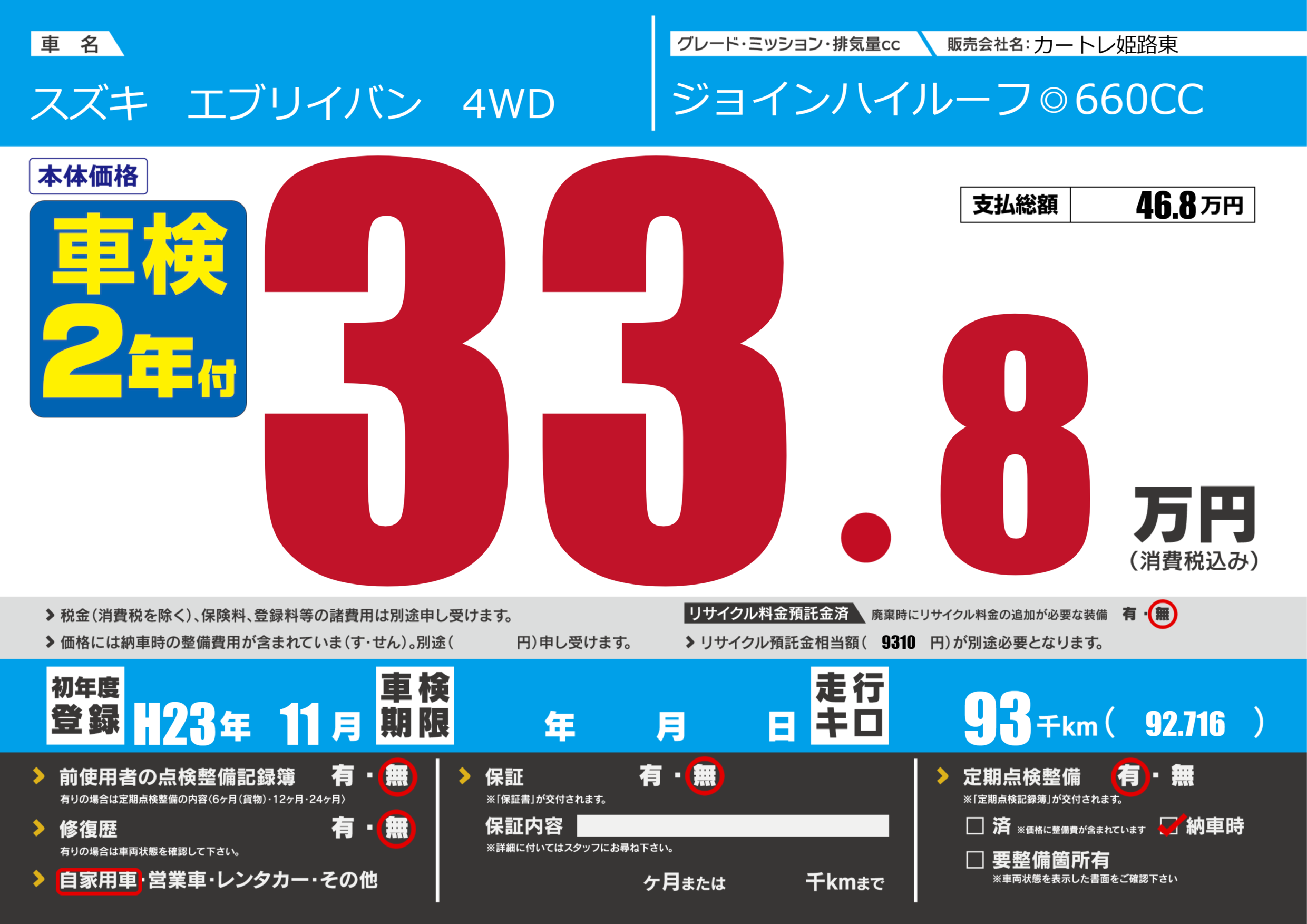 | 走行キロ | 9.3万km | 初年度登録 | H23年11月 |
