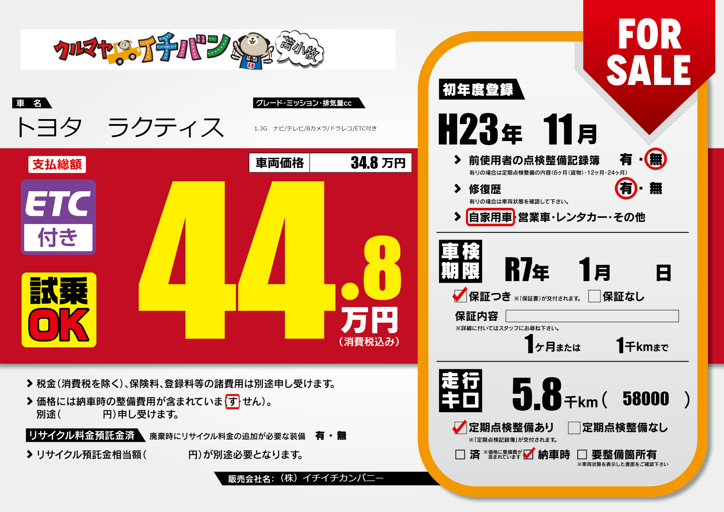 | 車名 | トヨタ ラクティス | グレード ミッション 排気量 |
