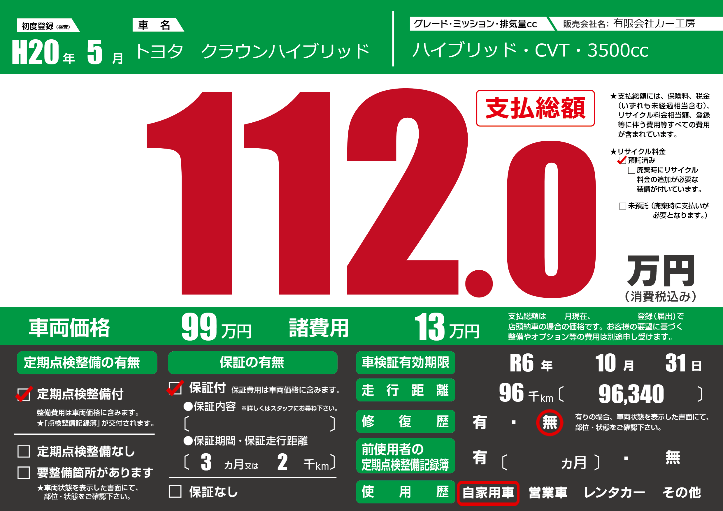 | 車名 | トヨタ クラウンハイブリッド | グレード ミッション 排気量 |