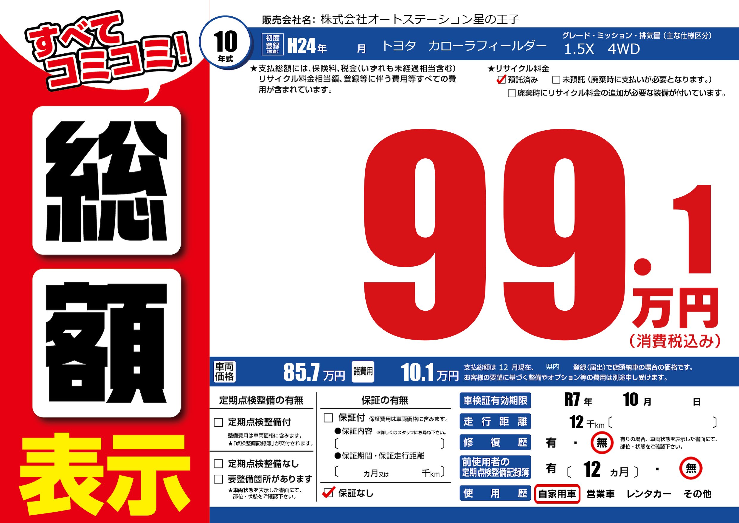 | 車名 | トヨタ カローラフィールダー | グレード ミッション 排気量 |