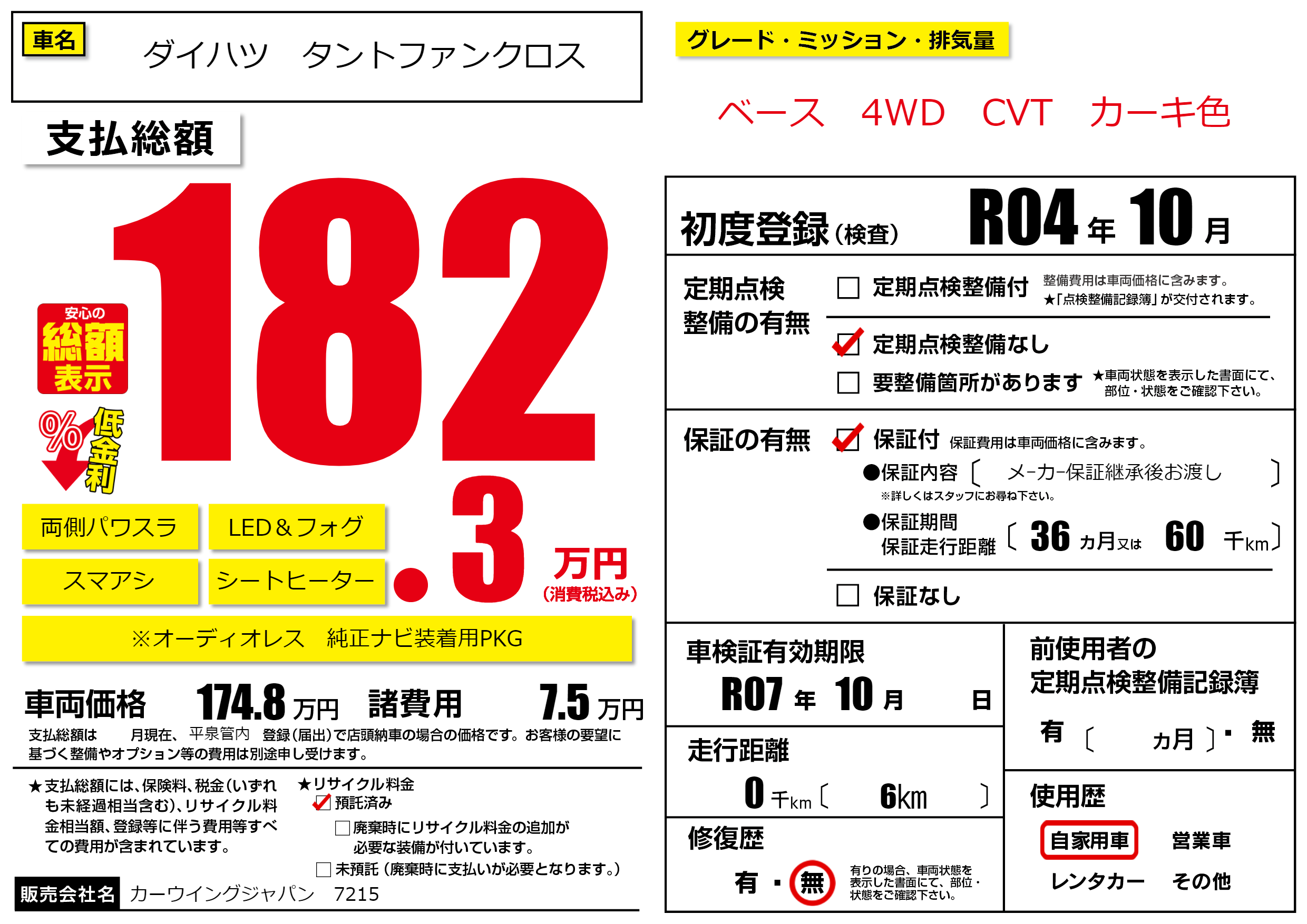| 車名 | ダイハツ タントファンクロス | グレード ミッション 排気量 |