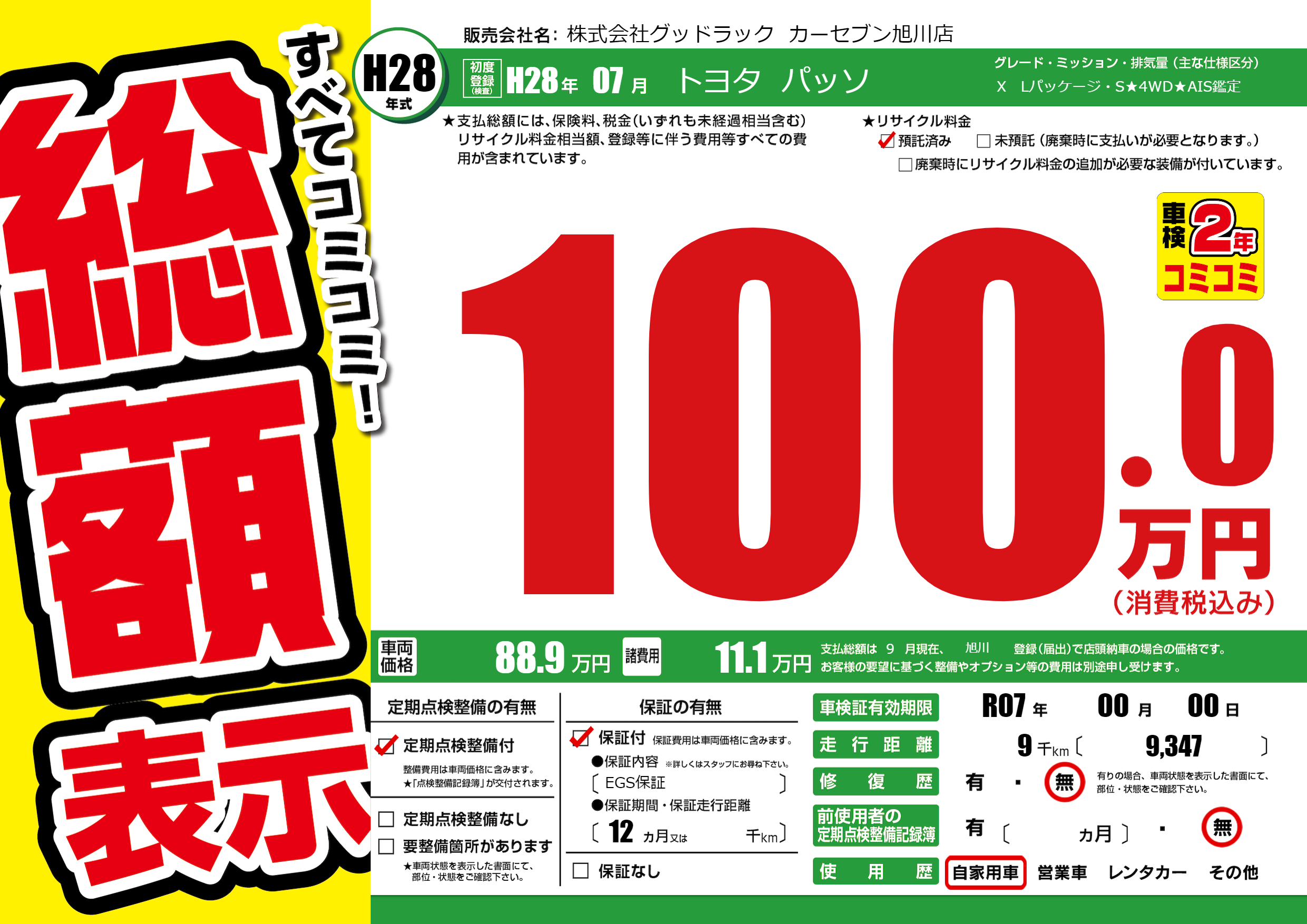 | 車名 | トヨタ パッソ | グレード ミッション 排気量 |
