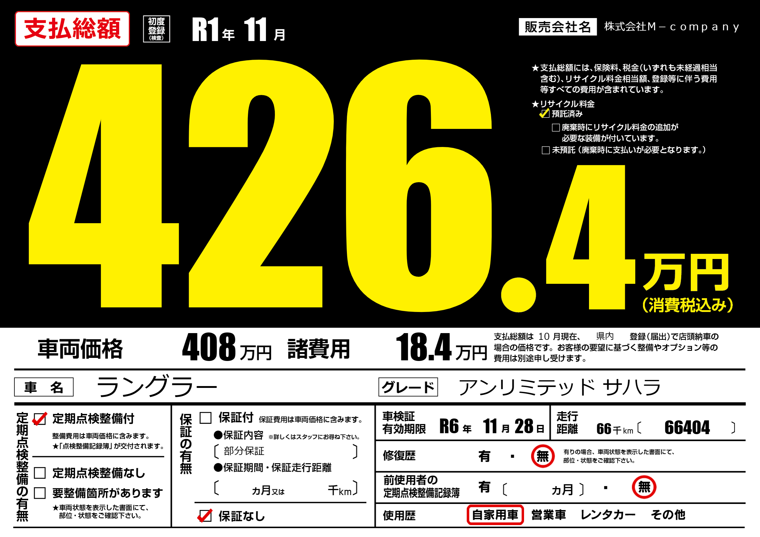 | 走行キロ | 6.6万km | 初年度登録 | R1年11月 |