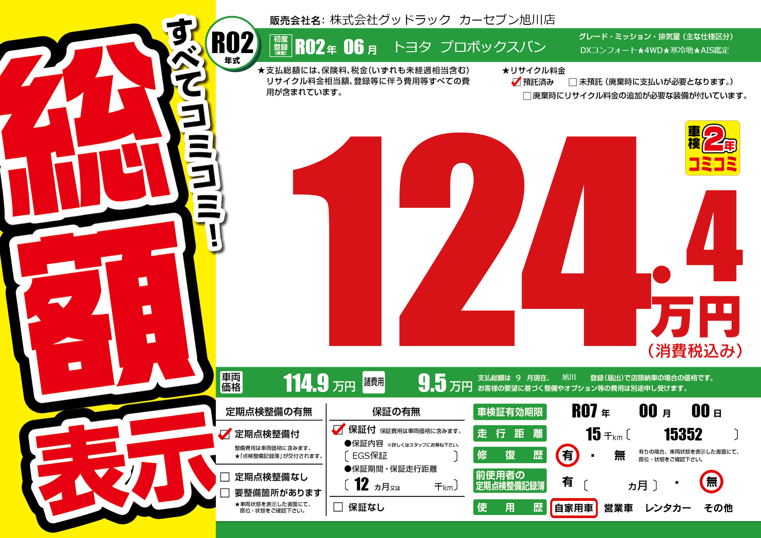| 車名 | トヨタ プロボックスバン | グレード ミッション 排気量 |