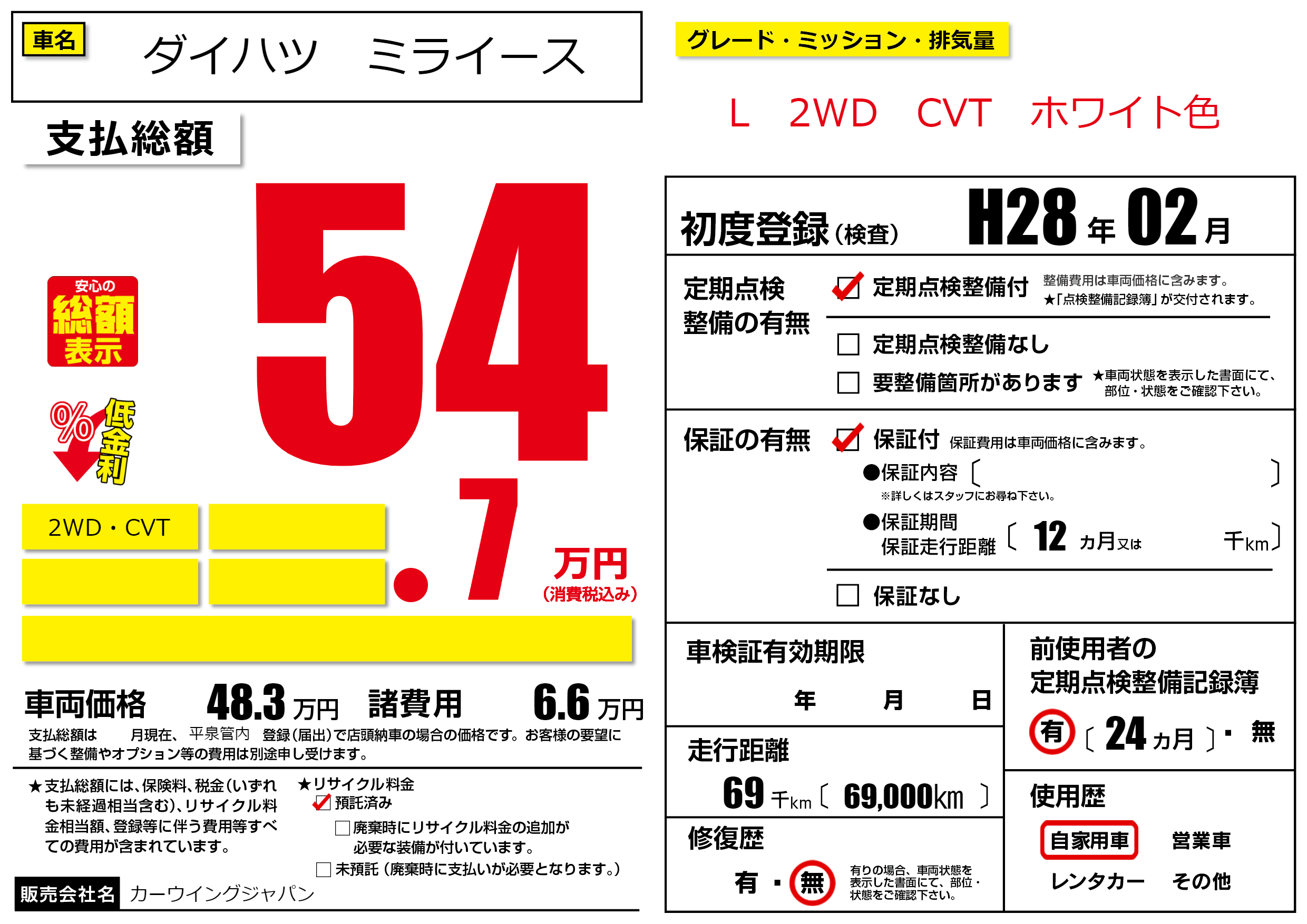 保証付き 保証内容(---) 12ヶ月または()千kmまで |