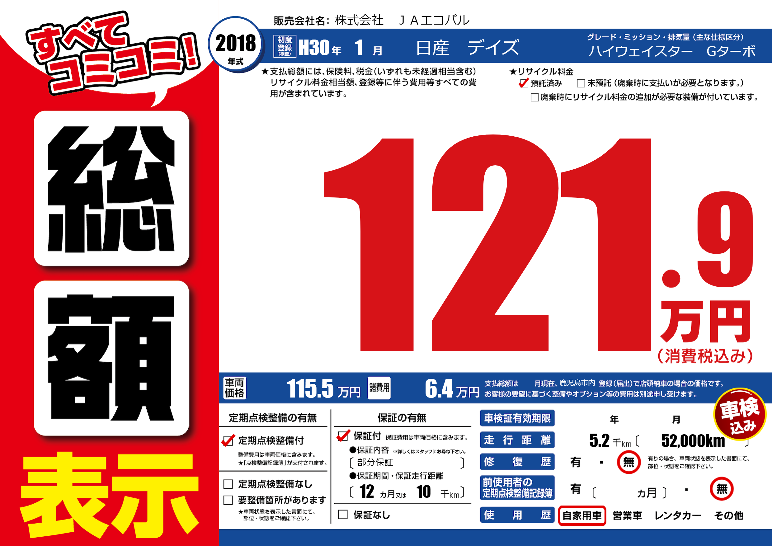 | 車名 | 日産 デイズ | グレード ミッション 排気量 |