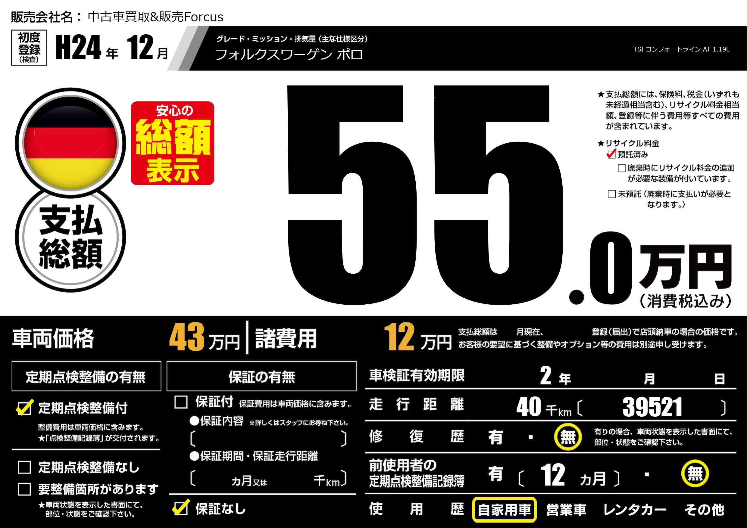 | 車名 | フォルクスワーゲン ポロ | グレード ミッション 排気量 |
