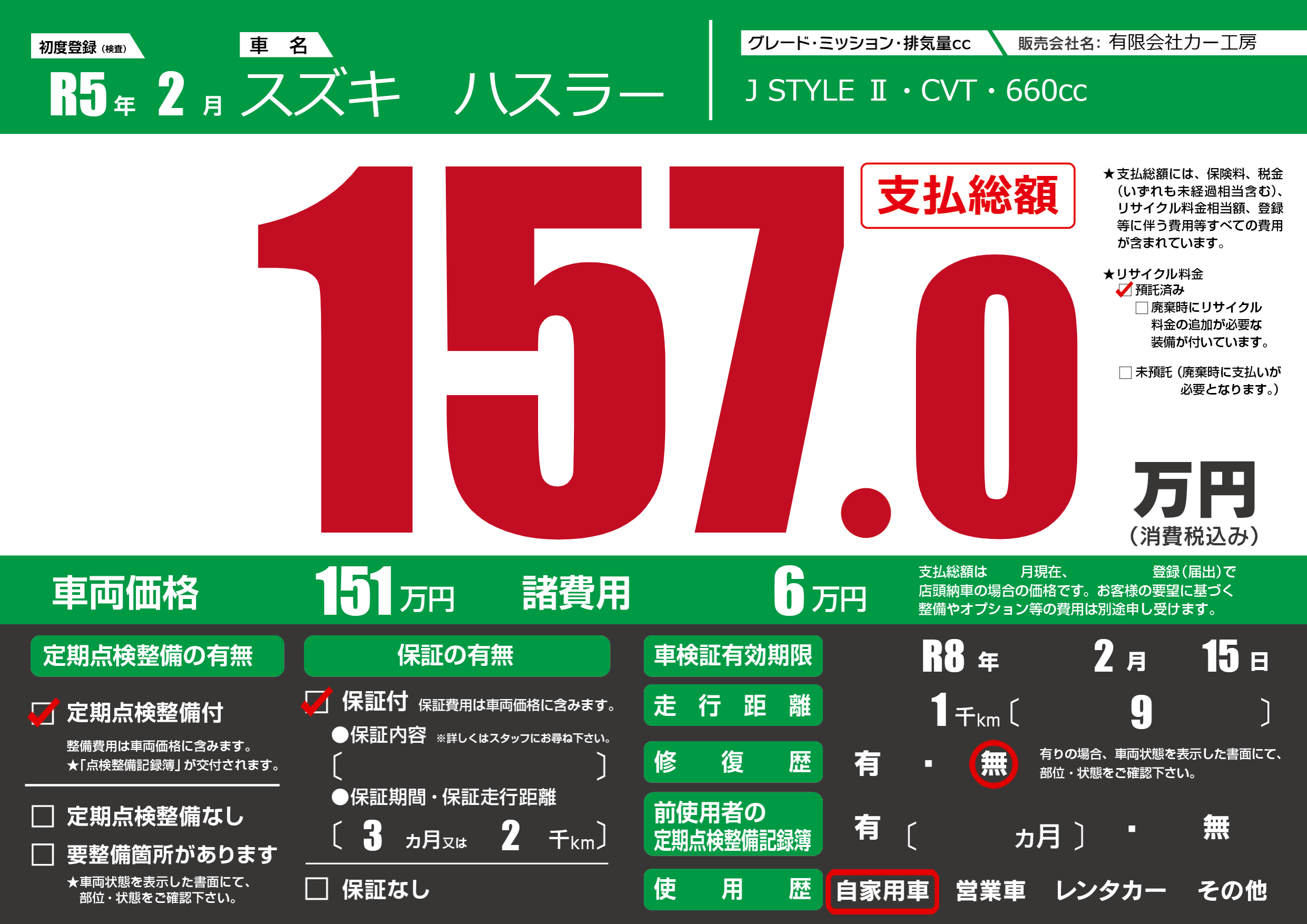 | 走行キロ | 0.1万km | 初年度登録 | R5年2月 |