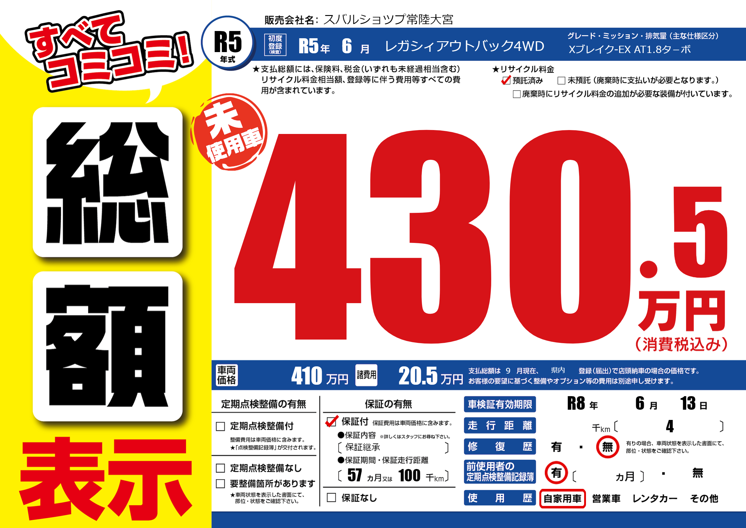 保証付き 保証内容(保証継承) 57ヶ月または(100)千kmまで |