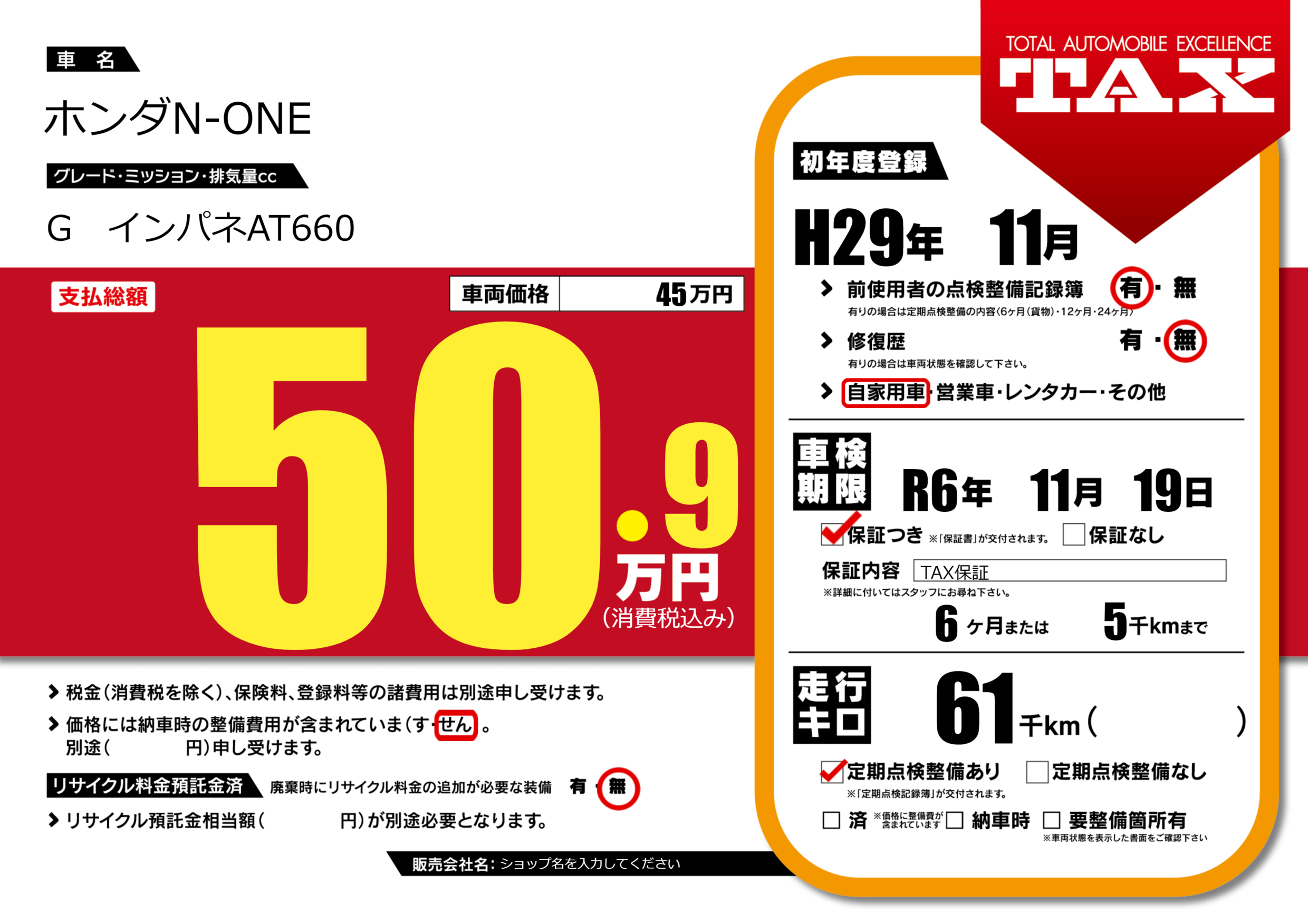 保証付き 保証内容(TAX保証) 6ヶ月または(5)千kmまで |