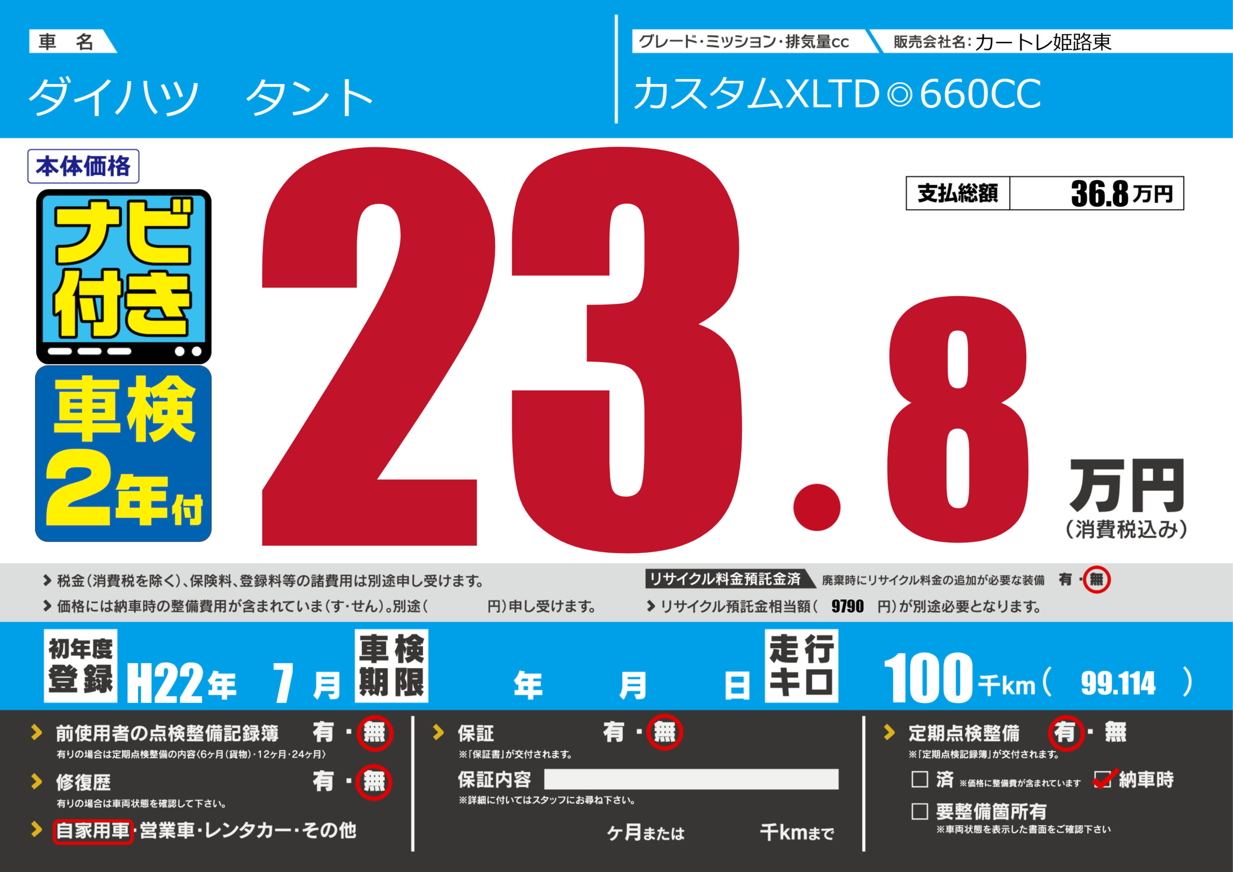 | 走行キロ | 10万km | 初年度登録 | H22年7月 |