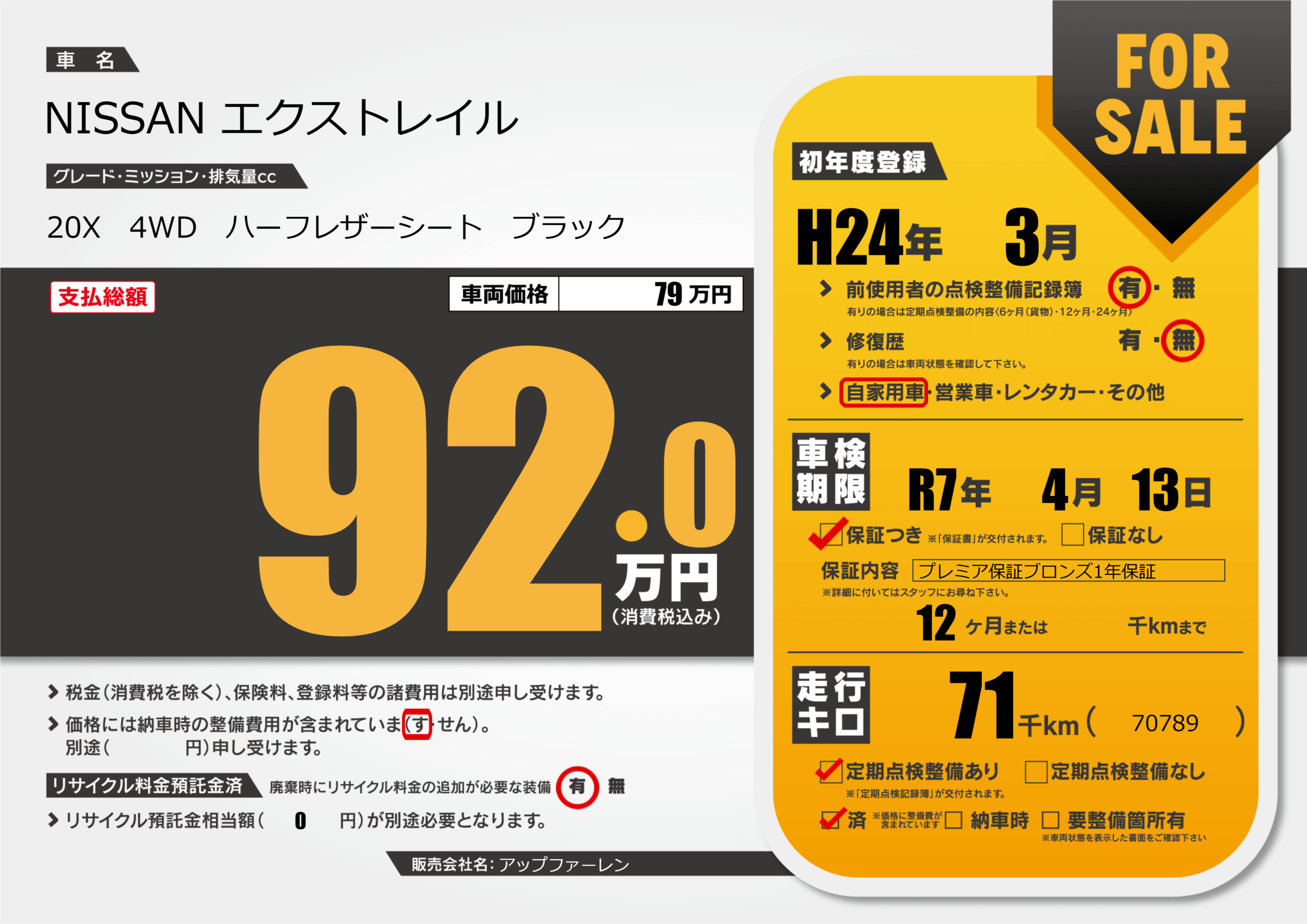 | 定期点検整備 | 定期点検整備あり 定期点検整備済み | ||