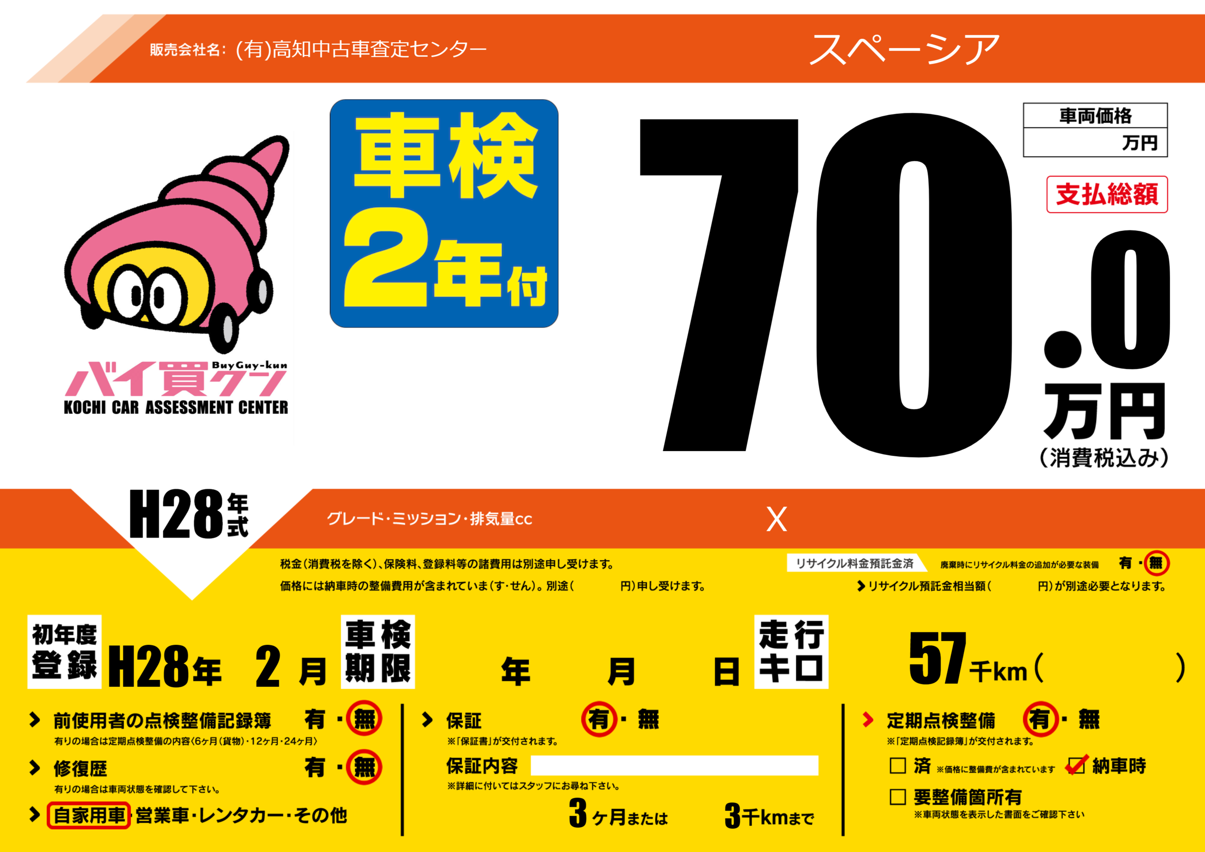 | 走行キロ | 5.7万km | 初年度登録 | H28年2月 |