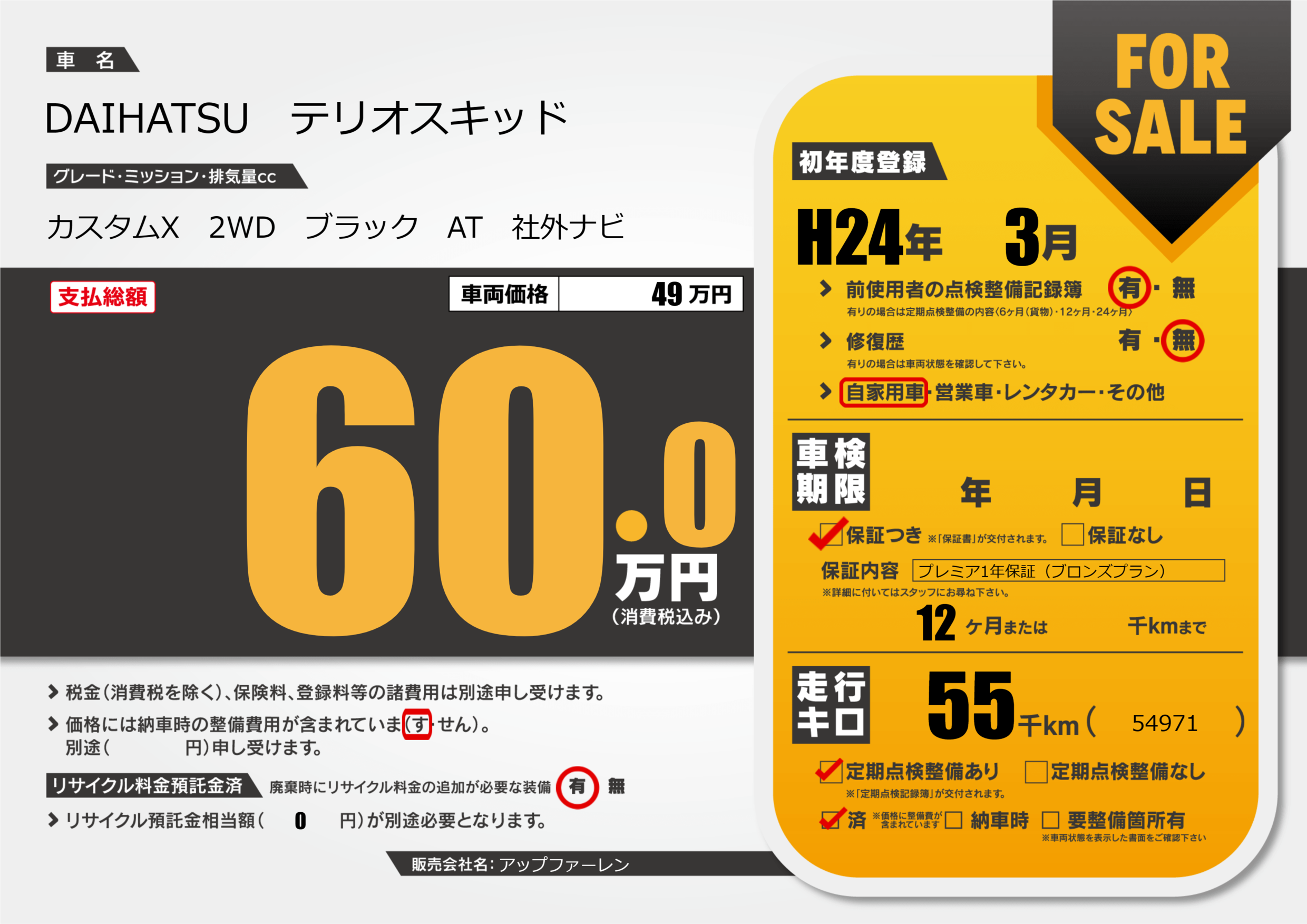 | 定期点検整備 | 定期点検整備あり 定期点検整備済み | ||
