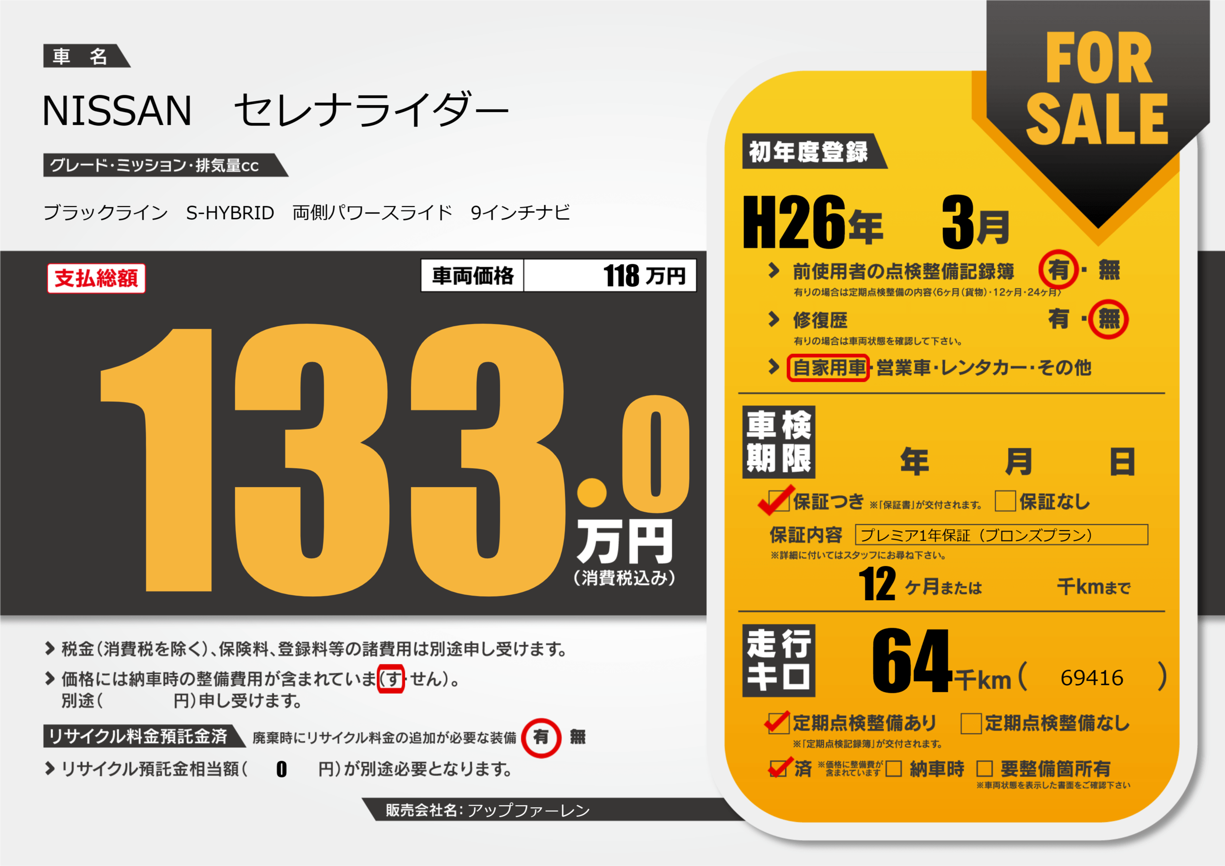 | 定期点検整備 | 定期点検整備あり 定期点検整備済み | ||