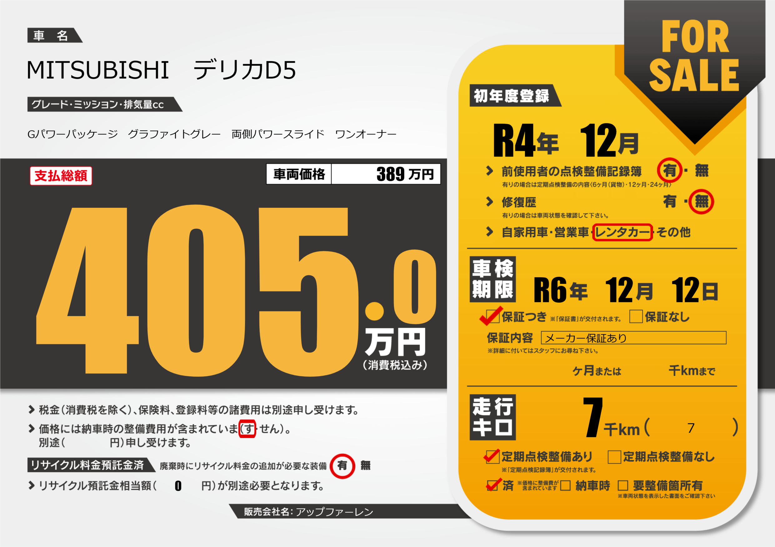| 車名 | MITSUBISHI デリカD5 | グレード ミッション 排気量 |