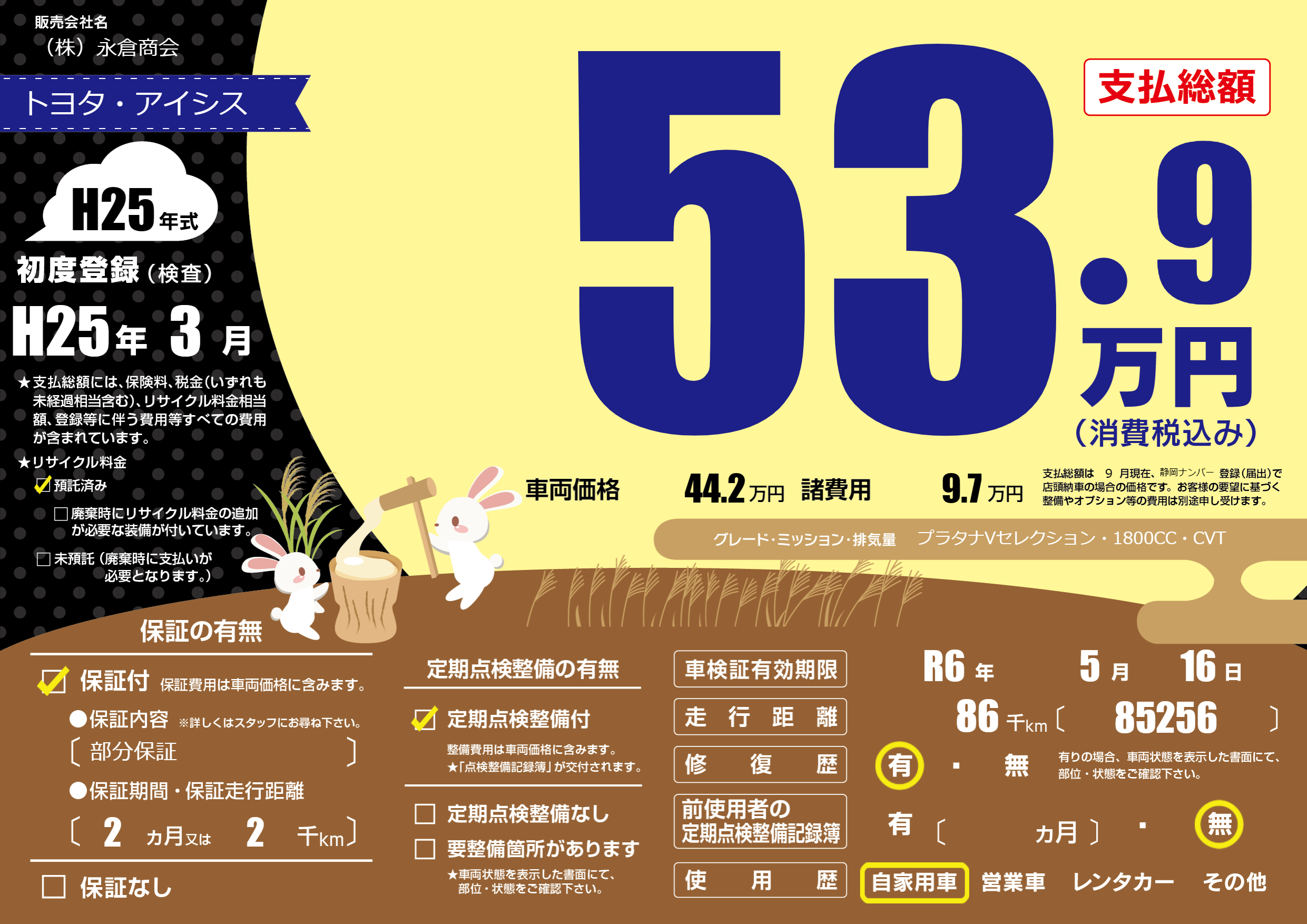 | 走行キロ | 8.6万km | 初年度登録 | H25年3月 |