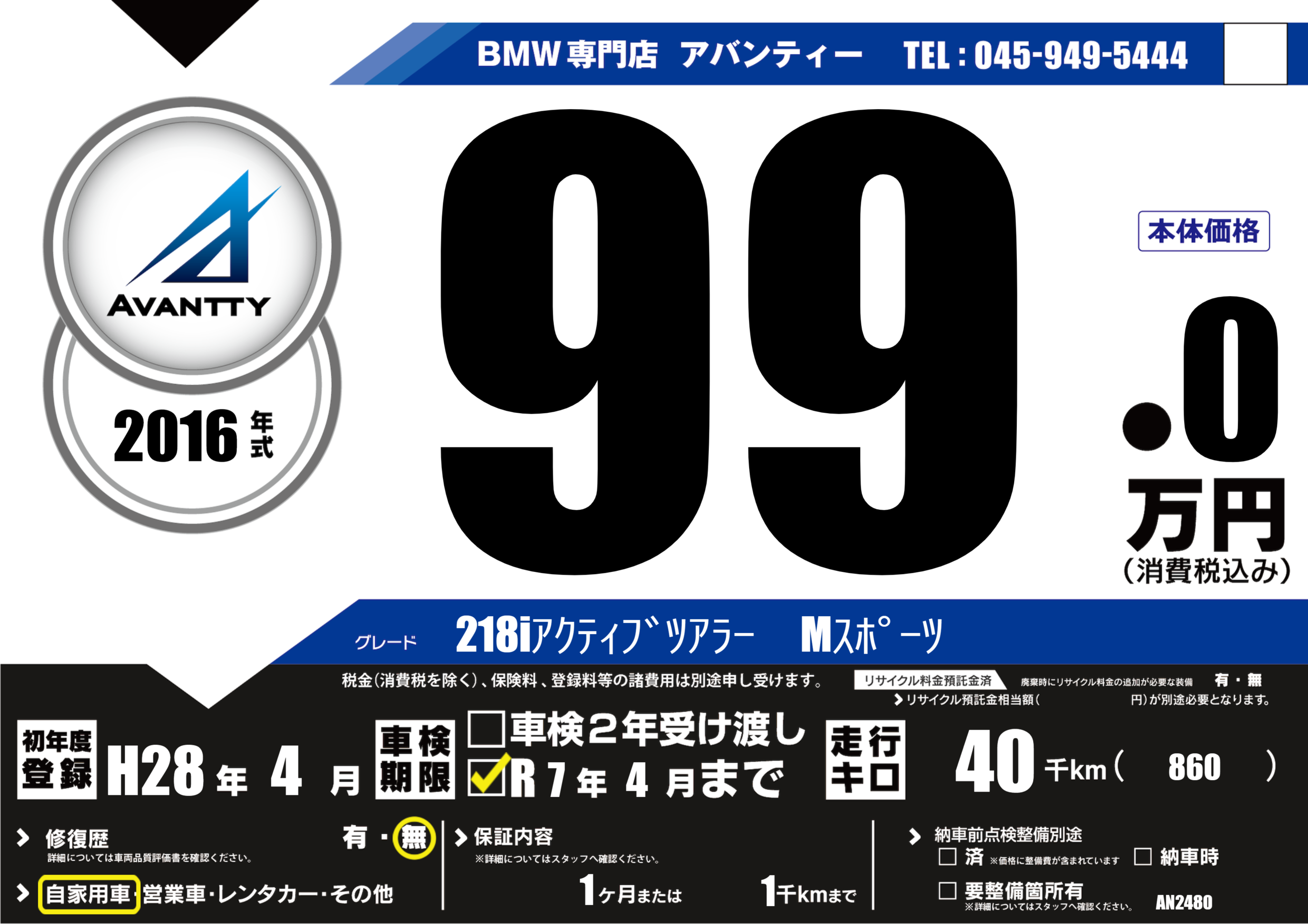 | 走行キロ | 4万km | 初年度登録 | H28年4月 |