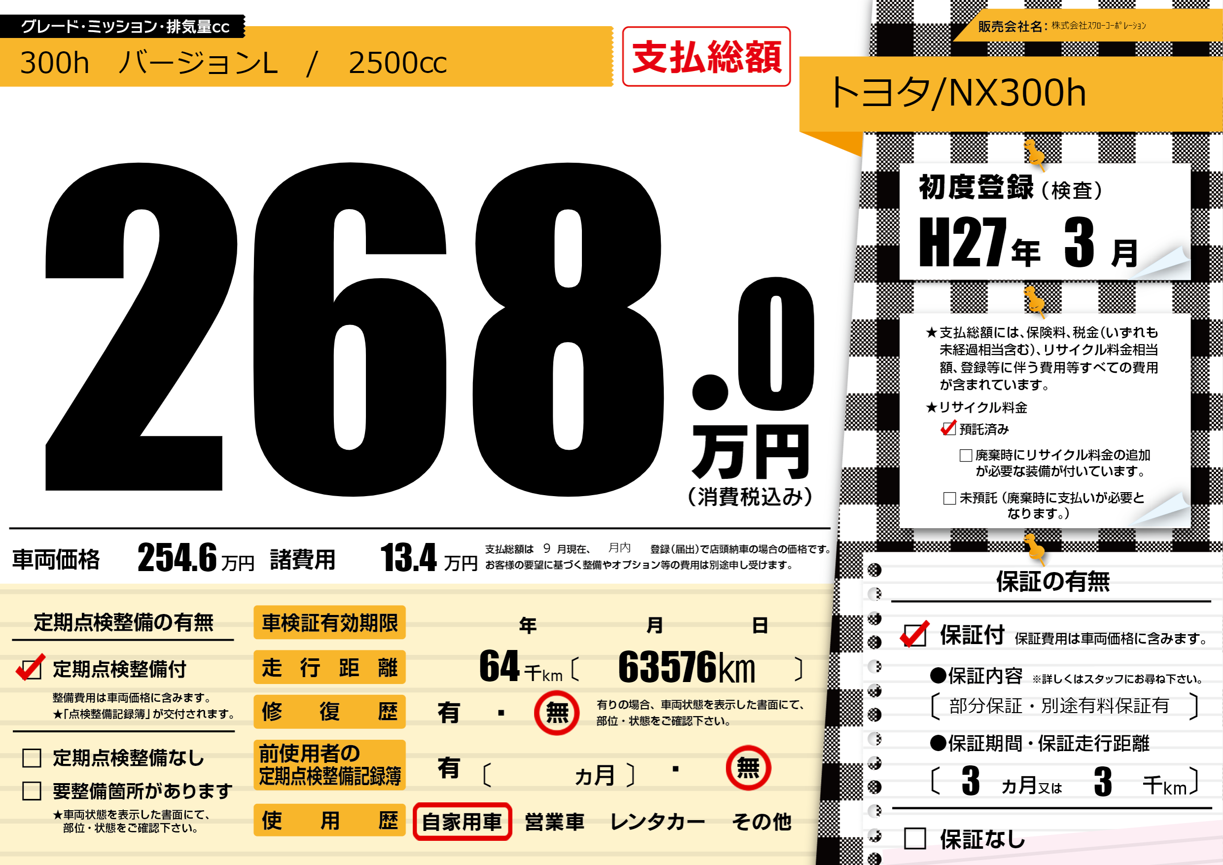 | 車名 | トヨタ/NX300h | グレード ミッション 排気量 |
