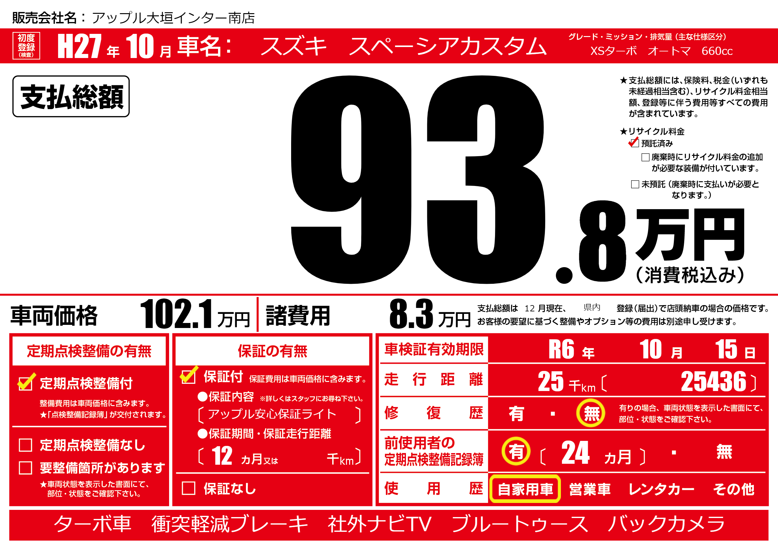 | 車検制限 | R6年 10月 15日 | ||