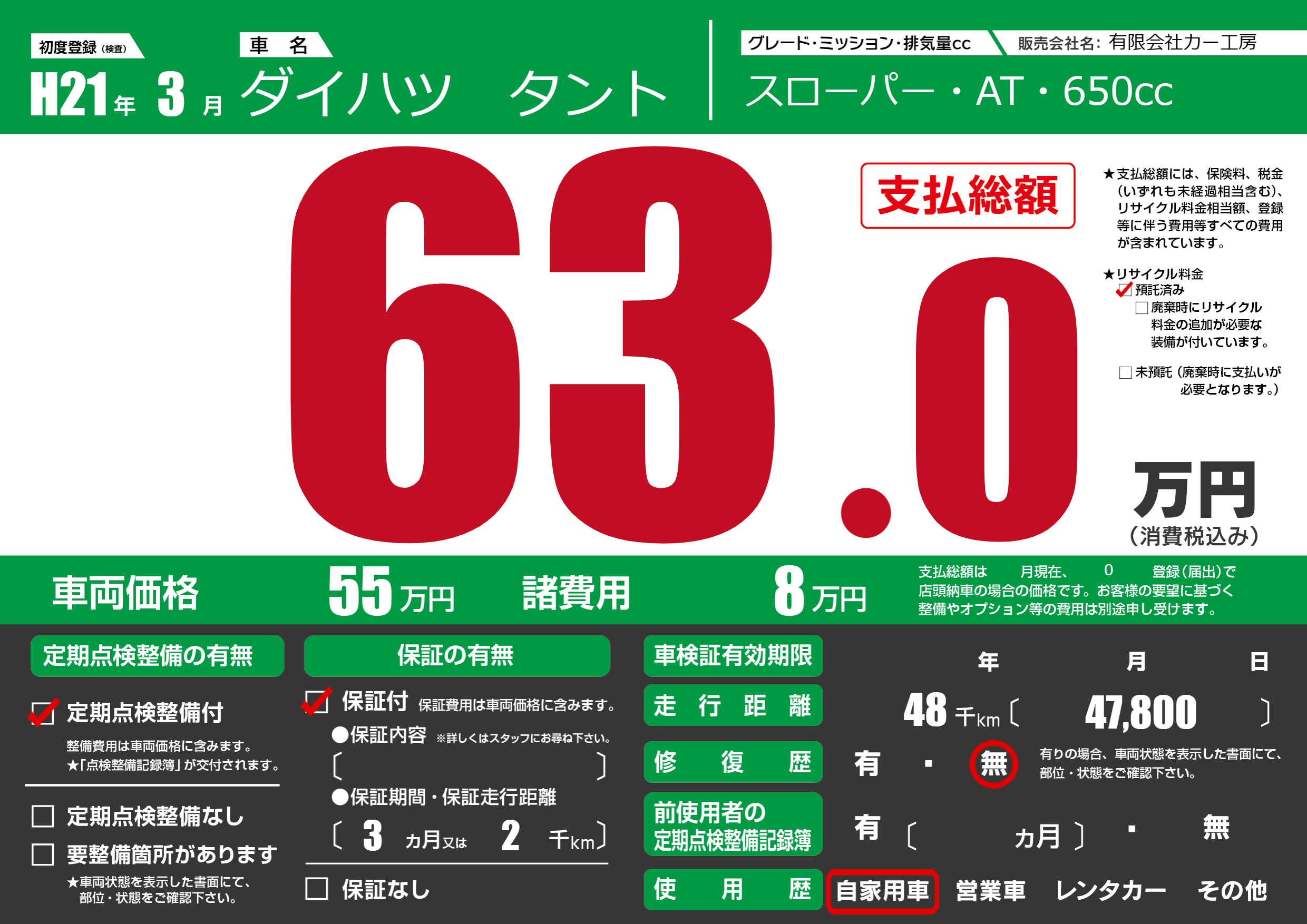 | 車名 | ダイハツ タント | グレード ミッション 排気量 |