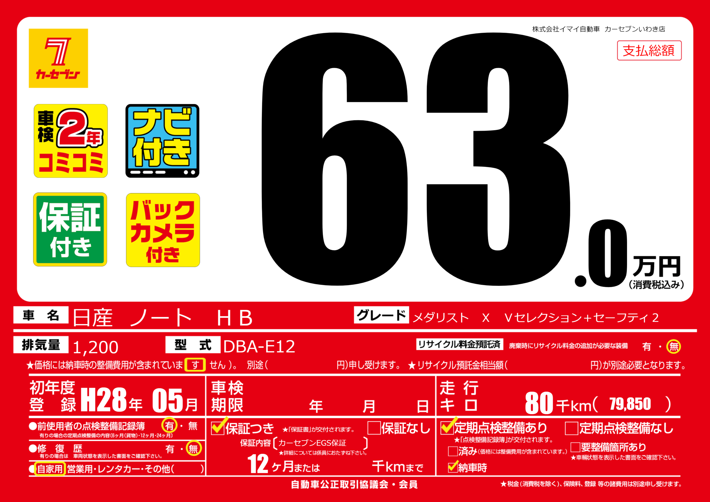 | 車名 | 日産 ノート HB | グレード ミッション 排気量 |