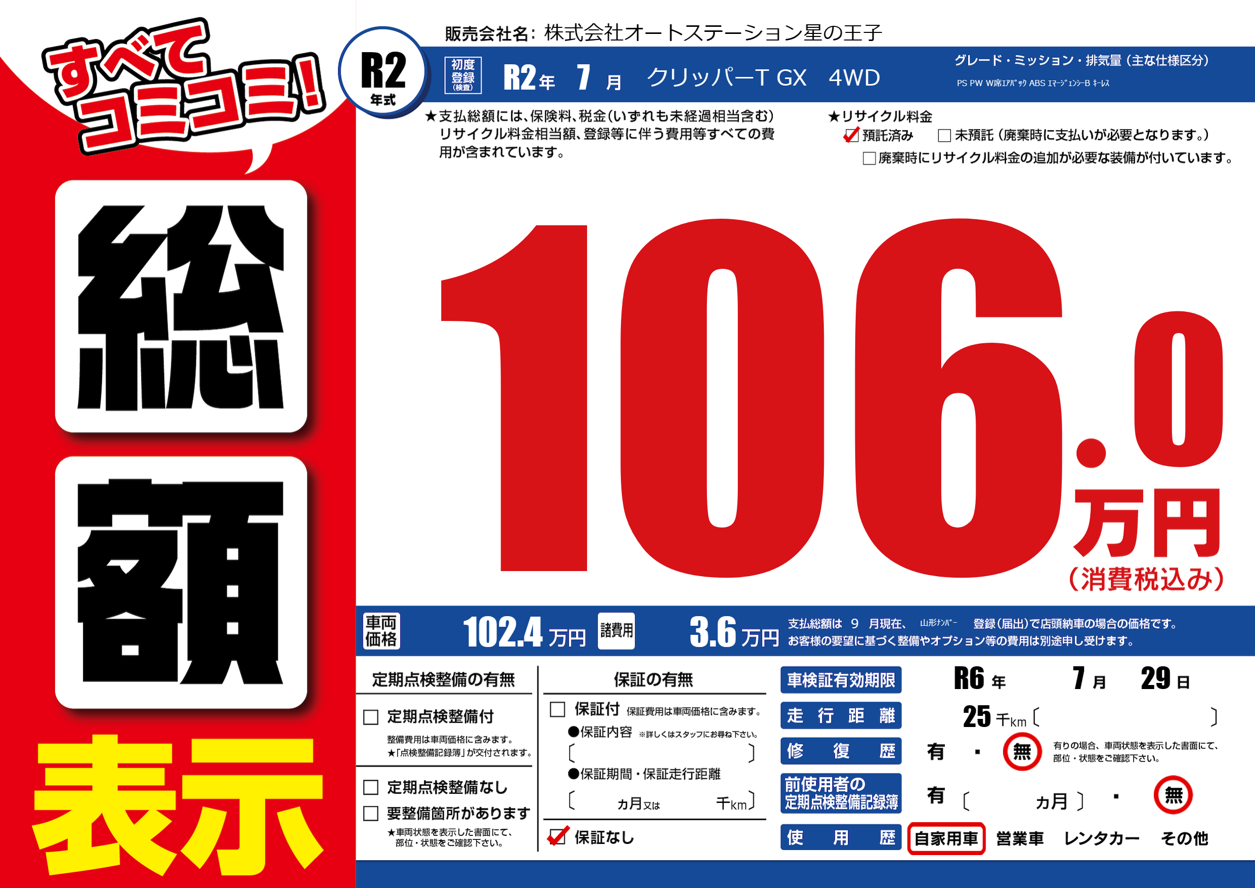 | 車名 | クリッパーT GX 4WD | グレード ミッション 排気量 |