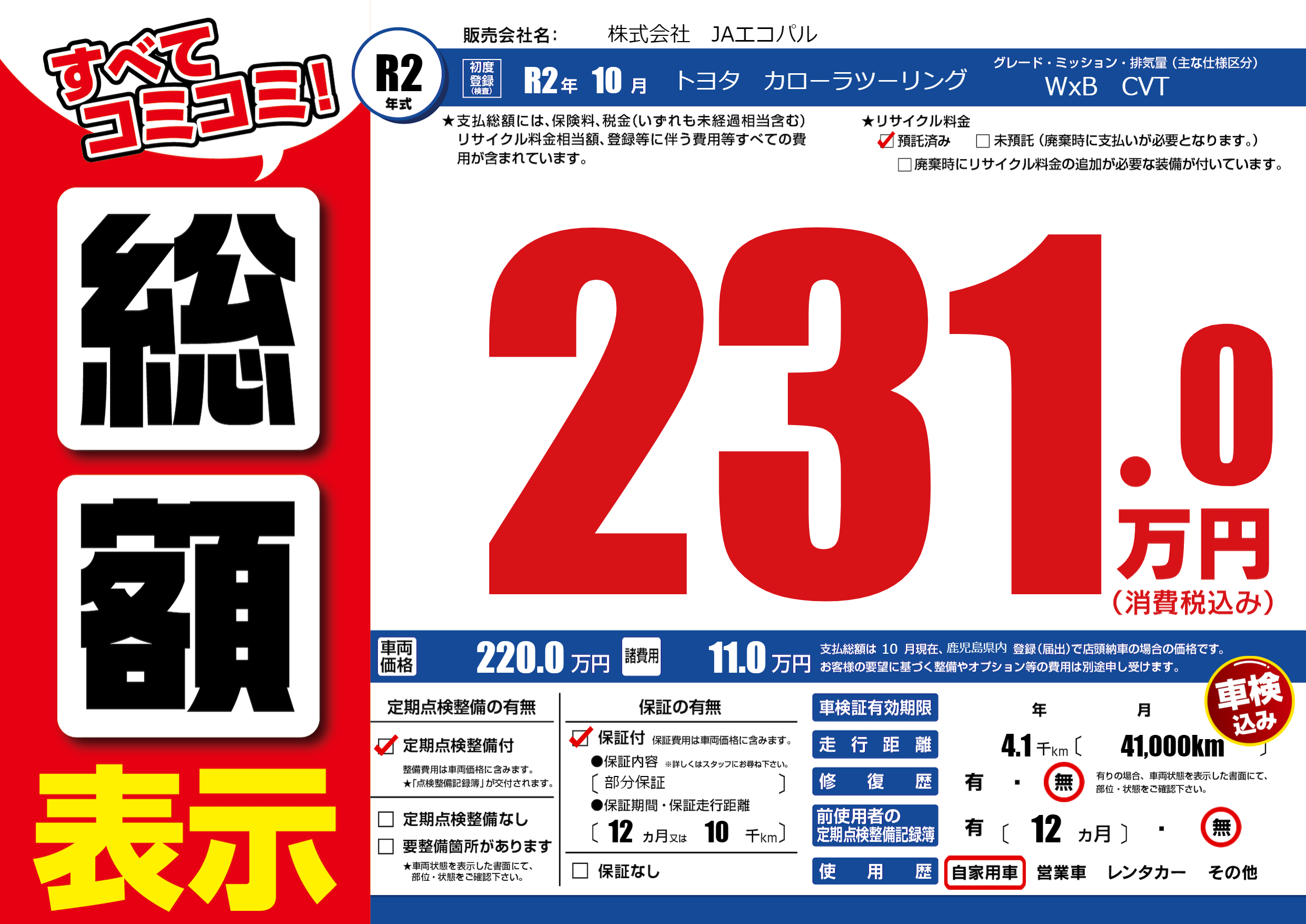 | 車名 | トヨタ カローラツーリング | グレード ミッション 排気量 |